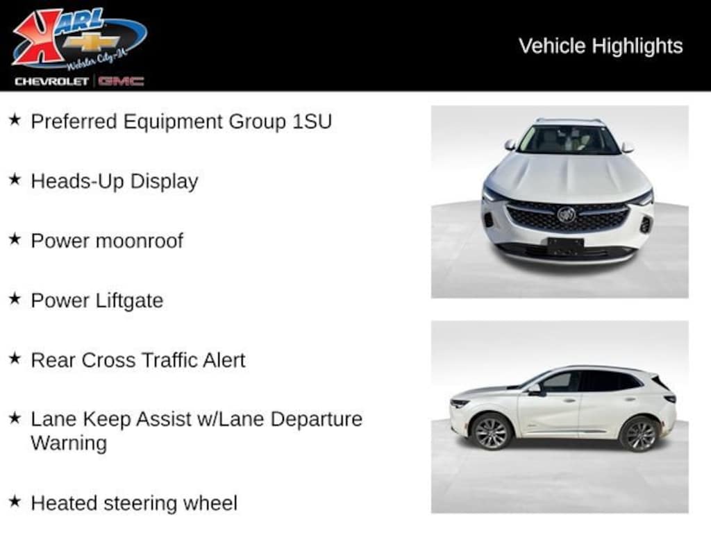 Certification Program Details: Karl Chevrolet/GMC Webster City, CarBravo Certified Dealer! Every CarBravo Certified vehicle includes: Comprehensive 126-Point Inspection Professionally inspected by factory-trained technicians to meet strict mechanical, safety, and cosmetic standards. 12-Month / 12,000-Mile Bumper-to-Bumper Limited Warranty Enjoy added peace of mind with extensive coverage from the day you drive off the lot. 24/7 Roadside Assistance & Courtesy Transportation Flat tire? Dead battery? Need a tow? You're covered anywhere, anytime throughout the warranty period. Vehicle History & Title Guarantee Clean title, completed safety recalls, and a full CARFAX® or AutoCheck® report provided for complete transparency. 10-Day / 500-Mile Exchange Promise If you don't absolutely love it, bring it back and exchange it no hassle, no stress. Experience peace of mind and premium protection exclusively from Karl Chevrolet/GMC in Webster City!!- LPO, CARGO AREA TRAY- White Frost Tricoat- Preferred Equipment Group 1SU- Heads-Up Display- Power Liftgate- Heated steering wheel- Lane Keep Assist w/Lane Departure Warning- Rear Cross Traffic Alert- Power moonroofThis 2023 Buick Envision Avenir is a sophisticated and well-equipped SUV that offers a refined driving experience and a wealth of advanced features. With its turbocharged 2.0L engine and all-wheel-drive capability, this Envision delivers responsive performance and confident handling, while the 9-speed automatic transmission ensures smooth and efficient power delivery.Step inside the Envision Avenir and you'll be greeted by a beautifully crafted interior that combines premium materials, thoughtful design, and cutting-edge technology. The Bose premium audio system and the Buick Infotainment System with navigation provide an immersive multimedia experience, while the heated steering wheel, heated and ventilated front seats, and power moonroof add to the overall comfort and convenience.Safety is also a top priority in the Envision Avenir, with features like Lane Keep Assist, Rear Cross Traffic Alert, and Automatic Emergency Braking helping to keep you and your passengers protected on the road. The Heads-Up Display puts important driving information right in your line of sight, allowing you to stay focused on the task at hand.As a CarBravo Certified vehicle, this Envision Avenir has undergone a comprehensive 126-point inspection by our factory-trained technicians, ensuring it meets the highest standards of quality and reliability. You'll also enjoy the added peace of mind of a 12-month/12,000-mile bumper-to-bumper limited warranty, 24/7 roadside assistance, and a 10-day/500-mile exchange promise.Don't miss the opportunity to experience the exceptional craftsmanship, advanced technology, and premium features of the 2023 Buick Envision Avenir. Visit our showroom today and let our knowledgeable team help you discover why this SUV is the perfect choice for your next vehicle.At Karl Chevrolet/GMC we want to help you find the best new or used car in Webster City that suits your needs. When you buy a new car at Karl Chevrolet/GMC you know you're finding a vehicle you can rely on. We have a great selection of CarBravo Quality Pre-Owned Vehicles. We also pride ourselves in creating a friendly atmosphere and a reliable Dealership that you can trust. Call us and our experts will be glad to help you! (515) 209-7117. *Equipment and options are generated by a 3rd party vendor, exact vehicle options may vary. Please see a salesperson for complete details and vehicle information.