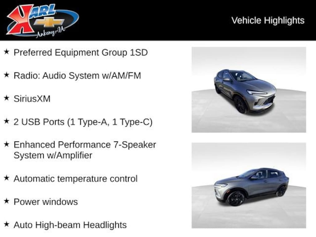 At Karl Chevrolet we want to help you find the best new or used car in Ankeny that suits your needs. Check out the 2024 Buick Encore GX For Sale in Ankeny, IA. When you buy a new car at Karl Chevrolet you know you're finding a vehicle you can rely on. We have a great selection of Platinum Quality Pre-Owned Vehicles. We also pride ourselves in creating a friendly atmosphere and reliable new car dealership that you can trust. Call us with any questions about our 2024 Buick Encore GX and our experts will be glad to help you! (515) 299-4300. *Equipment and options are generated by a 3rd party vendor, exact vehicle options may vary. Please see a salesperson for complete details and vehicle information.