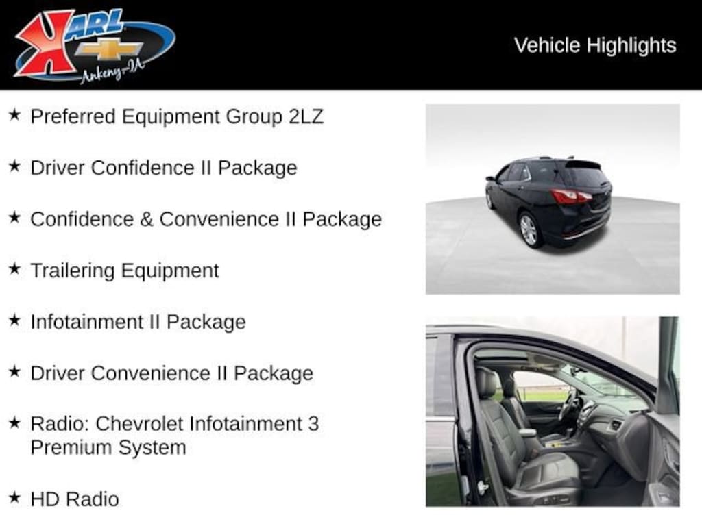 At Karl Chevrolet we want to help you find the best new or used car in Ankeny that suits your needs. When you buy a new car at Karl Chevrolet you know you're finding a vehicle you can rely on. We have a great selection of Platinum Quality Pre-Owned Vehicles. We also pride ourselves in creating a friendly atmosphere and a reliable Dealership that you can trust. Call us and our experts will be glad to help you! (515) 299-4300. *Equipment and options are generated by a 3rd party vendor, exact vehicle options may vary. Please see a salesperson for complete details and vehicle information.