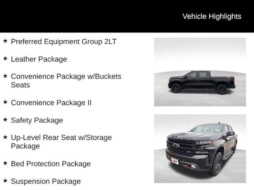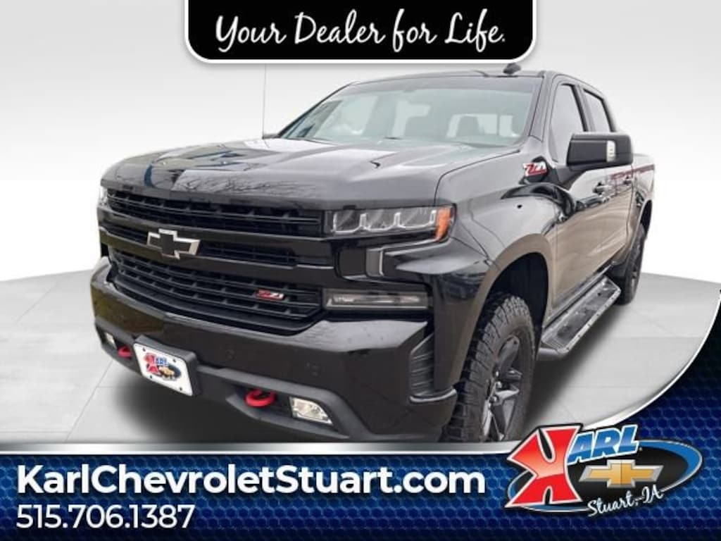 Certified.Black LT Trail Boss 4WD EcoTec3 5.3L V810-Way Power Driver Seat w/Lumbar, 12-Volt Rear Auxiliary Power Outlet, 120-Volt Bed Mounted Power Outlet, 120-Volt Instrument Panel Power Outlet, 170 Amp Alternator, 2 USB Ports, 2 USB Ports (First Row), 4-Way Manual Driver Seat Adjuster, 4.2 Diagonal Color Display Driver Info Center, 6-Speaker Audio System, All-Weather Floor Liner (LPO) (AAK), Auxiliary External Transmission Oil Cooler, Bed Protection Package, Bluetooth® For Phone, Chevrolet Connected Access, Chevrolet w/4G LTE, Chevytec Spray-On Black Bedliner, Color-Keyed Carpeting Floor Covering, Compass, Convenience Package II, Convenience Package w/Buckets Seats, Deep-Tinted Glass, Dual Exhaust w/Polished Outlets, Dual-Zone Automatic Climate Control, Electric Rear-Window Defogger, Electrical Lock Control Steering Column, Electronic Cruise Control, Floor Mounted Console, Front Bucket Seats, Front LED Fog Lamps, HD Radio, HD Rear Vision Camera, Heated Driver & Front Passenger Seats, Heated Steering Wheel, Heavy-Duty Rear Locking Differential, High Capacity Air Filter, High Gloss Black Grille, High Gloss Black Mirror Caps, Hill Descent Control, Hitch Guidance, Keyless Open & Start, Lane Change Alert w/Side Blind Zone Alert, Leather Appointed Seat Trim, Leather Package, Leather Wrapped Steering Wheel, LED Cargo Area Lighting, Manual Tilt Wheel Steering Column, Manual Tilt/Telescoping Steering Column, OnStar & Chevrolet Connected Services Capable, Performance Red Recovery Hooks, Perimeter Lighting, Power Door Locks, Power Front Windows w/Driver Express Up/Down, Power Front Windows w/Passenger Express Down, Power Rear Windows w/Express Down, Power Sliding Rear Window w/Rear Defogger, Preferred Equipment Group 2LT, Premium Bose 7-Speaker Sound System, Radio: Chevrolet Infotainment 3 Plus System, Rear 60/40 Folding Bench Seat (Folds Up), Rear Cross Traffic Alert, Rear Dual USB Charging-Only Ports, Rear Vision Camera, Rear Wheelhouse Liners, Remote Vehicle Starter System, Safety Package, Single-Zone Manual/Semi-Automatic Air Conditioning, SiriusXM Radio, Steering Wheel Audio Controls, Suspension Package, Theft Deterrent System (Unauthorized Entry), Trailering Package, Ultrasonic Front & Rear Park Assist, Universal Home Remote, Up-Level Rear Seat w/Storage Package.Here at Karl Chevrolet of Stuart we want to help you find the best vehicle to suit your needs. With our huge selection of new and pre-owned vehicles, we're sure to have the right car for you! We pride ourselves on creating a friendly buying experience and earning the title of Your Dealer for Life. Give us a call at 515.523.1201 and speak to our experts to find out just how easy it is to get the vehicle of your dreams!*Equipment and options are generated by a 3rd party vendor, exact vehicle options may vary. Please see a salesperson for complete details and vehicle information.Clean CARFAX. Odometer is 9331 miles below market average!Certification Program Details: Karl Chevrolet of Stuart, your newest CarBravo dealer, where platinum quality vehicles and unmatched benefits come together! -Comprehensive Limited Bumper to Bumper Warranty. -24/7 Roadside Assistance: -Multi-Point Vehicle Inspection: Every vehicle undergoes a Platinum Quality Certified Inspection known throughout the industry to ensure top quality. -Vehicle Exchange Program. Within 10-Days and 500 miles -Complimentary Vehicle History Report -Nationwide Dealer Network Support: Enjoy the backing of the extensive CarBravo and GM dealership network. -OnStar and SiriusXM Trials: Enjoy connected services and entertainment with included trial subscriptions. -Terms and conditions may apply. With every vehicle purchased, you'll enjoy the peace of mind that comes with a limited warranty, 24/7 roadside assistance, and a comprehensive vehicle inspection.
