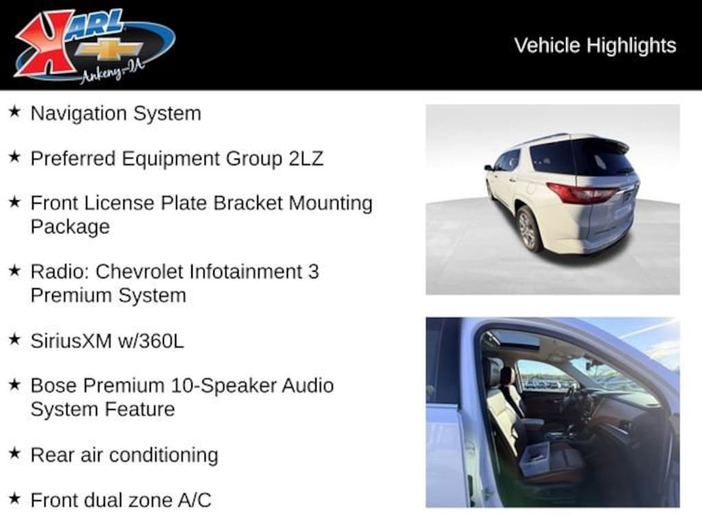 At Karl Chevrolet we want to help you find the best new or used car in Ankeny that suits your needs. Check out the 2021 Chevrolet Traverse For Sale in Ankeny, IA. When you buy a new car at Karl Chevrolet you know you're finding a vehicle you can rely on. We have a great selection of Platinum Quality Pre-Owned Vehicles. We also pride ourselves in creating a friendly atmosphere and reliable new car dealership that you can trust. Call us with any questions about our 2021 Chevrolet Traverse and our experts will be glad to help you! (515) 299-4300. *Equipment and options are generated by a 3rd party vendor, exact vehicle options may vary. Please see a salesperson for complete details and vehicle information.