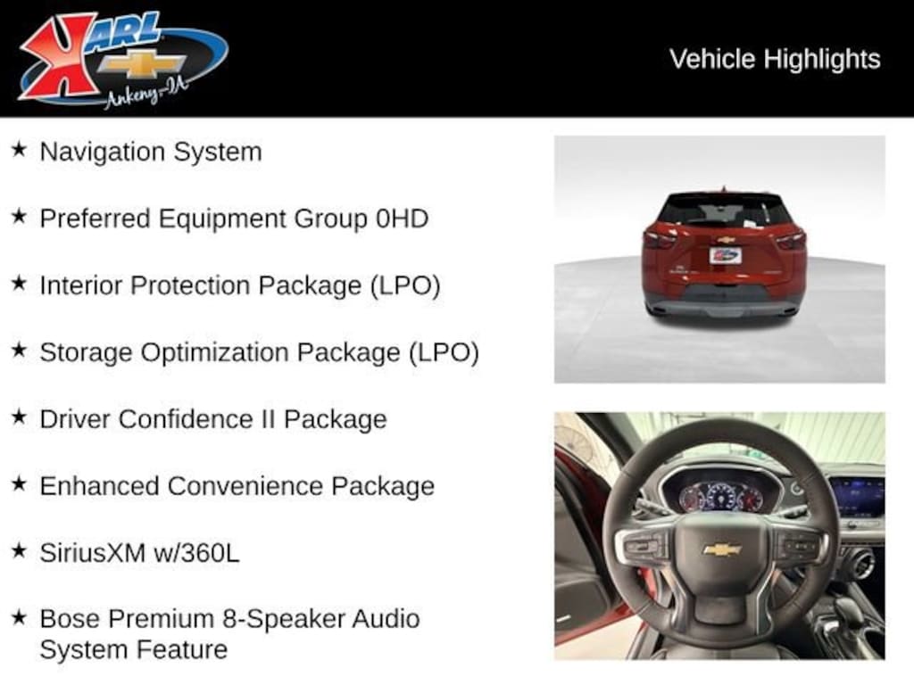 At Karl Chevrolet we want to help you find the best new or used car in Ankeny that suits your needs. Check out the 2022 Chevrolet Blazer For Sale in Ankeny, IA. When you buy a new car at Karl Chevrolet you know you're finding a vehicle you can rely on. We have a great selection of Platinum Quality Pre-Owned Vehicles. We also pride ourselves in creating a friendly atmosphere and reliable new car dealership that you can trust. Call us with any questions about our 2022 Chevrolet Blazer and our experts will be glad to help you! (515) 299-4300. *Equipment and options are generated by a 3rd party vendor, exact vehicle options may vary. Please see a salesperson for complete details and vehicle information.
