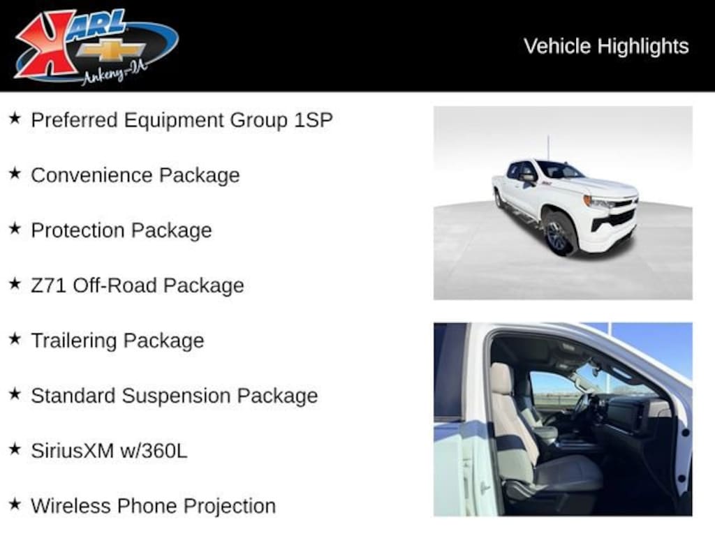At Karl Chevrolet we want to help you find the best new or used car in Ankeny that suits your needs. Check out the 2022 Chevrolet Silverado 1500 For Sale in Ankeny, IA. When you buy a new car at Karl Chevrolet you know you're finding a vehicle you can rely on. We have a great selection of Platinum Quality Pre-Owned Vehicles. We also pride ourselves in creating a friendly atmosphere and reliable new car dealership that you can trust. Call us with any questions about our 2022 Chevrolet Silverado 1500 and our experts will be glad to help you! (515) 299-4300. *Equipment and options are generated by a 3rd party vendor, exact vehicle options may vary. Please see a salesperson for complete details and vehicle information.