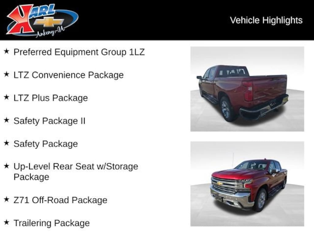 Recent Arrival! CARFAX One Owner, Local Trade & Sold New at Karls! Clean CARFAX. Certified. Cherry Red Tintcoat 2022 Chevrolet Silverado 1500 LTD LTZ 4WD CREW 147 EcoTec3 5.3L V8 2 USB Ports, 2 USB Ports (First Row), 4.2 Diagonal Color Display Driver Info Center, Adaptive Cruise Control, Advanced Trailering System, Apple CarPlay/Android Auto, Auto-Dimming Inside Rear-View Mirror, Auto-Locking Rear Differential, Automatic Emergency Braking, Auxiliary External Transmission Oil Cooler, Bluetooth® For Phone, Chevrolet Connected Access Capable, Chrome Grille, Chrome Mirror Caps, Color-Keyed Carpeting Floor Covering, Compass, Deep-Tinted Glass, Driver Memory, Dual Exhaust w/Polished Outlets, Electric Rear-Window Defogger, Electronic Cruise Control, Floor Mounted Center Console, Following Distance Indicator, Forward Collision Alert, Front dual zone A/C, Front Frame-Mounted Black Recovery Hooks, Front LED Fog Lamps, Front Pedestrian Braking, Front Rubberized Vinyl Floor Mats, HD Rear Vision Camera, Heated Steering Wheel, Heavy-Duty Air Filter, Hill Descent Control, Hitch Guidance w/Hitch View, Integrated Trailer Brake Controller, IntelliBeam Automatic High Beam On/Off, Keyless Open & Start, Lane Change Alert w/Side Blind Zone Alert, Lane Keep Assist w/Lane Departure Warning, Leather Wrapped Steering Wheel, LED Cargo Area Lighting, LTZ Convenience Package, LTZ Plus Package, Manual Tilt/Telescoping Steering Column, Off-Road Suspension, OnStar & Chevrolet Connected Services Capable, Outside Heated Power-Adjustable Mirrors, Perimeter Lighting, Power Door Locks, Power driver seat, Power Sliding Rear Window w/Rear Defogger, Power Tailgate, Power windows, Preferred Equipment Group 1LZ, Rear Cross Traffic Alert, Rear Dual USB Charging-Only Ports, Rear Rubberized-Vinyl Floor Mats, Rear Wheelhouse Liners, Remote Vehicle Starter System, Safety Alert Seat, Safety Package, Safety Package II, Steering Wheel Audio Controls, Theft Deterrent System (Unauthorized Entry), Trailering Package, Ultrasonic Front & Rear Park Assist, Universal Home Remote, Up-Level Rear Seat w/Storage Package, Wheels: 20 x 9 Polished Finish, Wi-Fi Hot Spot Capable, Wireless Phone Projection, Z71 Off-Road Package. 15/20 City/Highway MPG 8-Speed Automatic 4WD