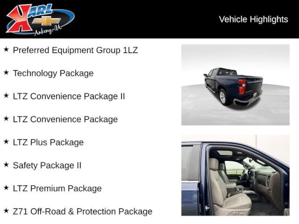 Recent Arrival! CARFAX One Owner, Local Trade & Sold New at Karls! Equipped With Running Boards, Mud Flaps & Tonneau Cover! Clean CARFAX. Certified. Northsky Blue Metallic 2022 Chevrolet Silverado 1500 LTD LTZ 4WD CREW CAB 147 LTZ EcoTec3 5.3L V8 15 Diagonal Multicolor Head-Up Display, 2 USB Ports, 2 USB Ports (First Row), 8 Driver Information Center, Adaptive Cruise Control, Advanced Trailering System, Apple CarPlay/Android Auto, Auto-Dimming Inside Rear-View Mirror, Auto-Locking Rear Differential, Auxiliary External Transmission Oil Cooler, Bed View Camera, Bluetooth® For Phone, Chevytec Spray-On Black Bedliner, Deep-Tinted Glass, Driver Memory, Electric Rear-Window Defogger, Electronic Cruise Control, Forward Collision Alert, Front Black Bowtie Emblem (LPO), Front dual zone A/C, Front Frame-Mounted Black Recovery Hooks, Front LED Fog Lamps, HD Surround Vision w/2 Trailer View Camera Provisions, Heated Driver & Front Outboard Passenger Seats, Heated Steering Wheel, Heavy-Duty Air Filter, Hill Descent Control, Hitch Guidance w/Hitch View, Integrated Trailer Brake Controller, IntelliBeam Automatic High Beam On/Off, Keyless Open & Start, Lane Change Alert w/Side Blind Zone Alert, Lane Keep Assist w/Lane Departure Warning, LED Cargo Area Lighting, LTZ Convenience Package, LTZ Convenience Package II, LTZ Plus Package, LTZ Premium Package, Manual Tilt/Telescoping Steering Column, Off-Road Suspension, Outside Heated Power-Adjustable Mirrors, Perimeter Lighting, Power Door Locks, Power driver seat, Power Sliding Rear Window w/Rear Defogger, Power Sunroof, Power Tailgate, Power windows, Preferred Equipment Group 1LZ, Premium Bose 7-Speaker Sound System, Radio: Chevrolet Infotainment 3 Premium System, Rear Camera Mirror, Rear Cross Traffic Alert, Rear Dual USB Charging-Only Ports, Rear Rubberized-Vinyl Floor Mats, Rear Wheelhouse Liners, Remote Vehicle Starter System, Safety Alert Seat, Safety Package, Safety Package II, Standard Tailgate, Steering Wheel Audio Controls, Technology Package, Theft Deterrent System (Unauthorized Entry), Trailering Package, Ultrasonic Front & Rear Park Assist, Universal Home Remote, Up-Level Rear Seat w/Storage Package, Ventilated Driver & Front Passenger Seats, Wheels: 20 x 9 Polished Finish, Wireless Charging, Wireless Phone Projection, Z71 Off-Road & Protection Package, Z71 Off-Road Package. 15/20 City/Highway MPG 8-Speed Automatic 4WD