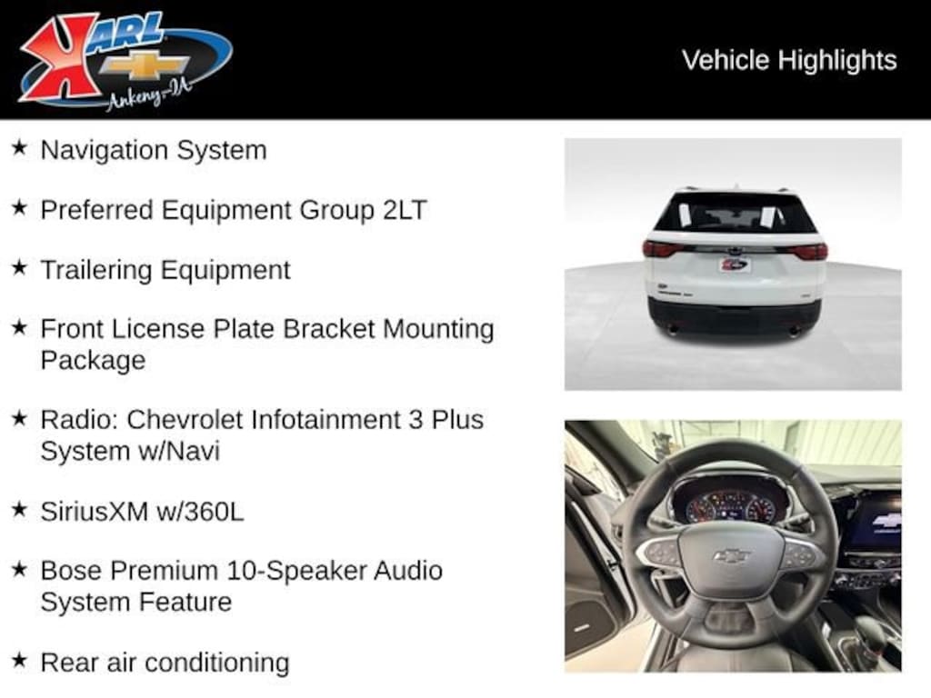 At Karl Chevrolet we want to help you find the best new or used car in Ankeny that suits your needs. Check out the 2023 Chevrolet Traverse For Sale in Ankeny, IA. When you buy a new car at Karl Chevrolet you know you're finding a vehicle you can rely on. We have a great selection of Platinum Quality Pre-Owned Vehicles. We also pride ourselves in creating a friendly atmosphere and reliable new car dealership that you can trust. Call us with any questions about our 2023 Chevrolet Traverse and our experts will be glad to help you! (515) 299-4300. *Equipment and options are generated by a 3rd party vendor, exact vehicle options may vary. Please see a salesperson for complete details and vehicle information.