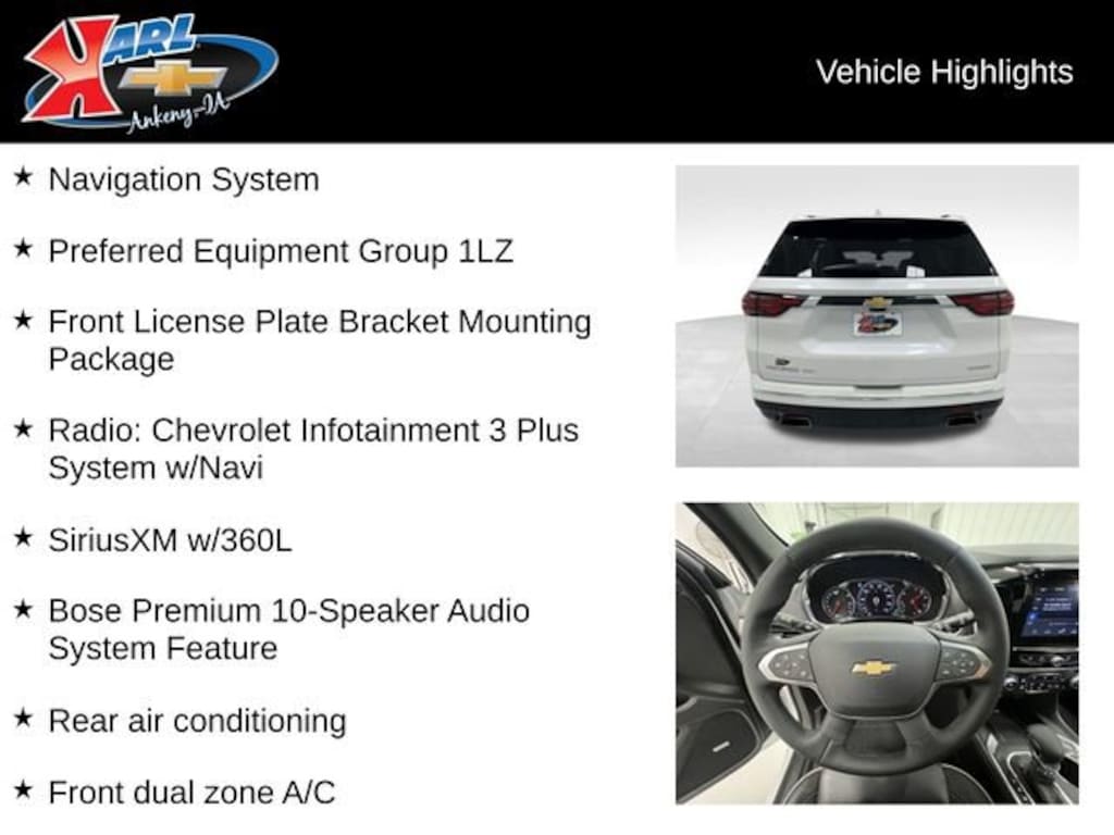 At Karl Chevrolet we want to help you find the best new or used car in Ankeny that suits your needs. Check out the 2023 Chevrolet Traverse For Sale in Ankeny, IA. When you buy a new car at Karl Chevrolet you know you're finding a vehicle you can rely on. We have a great selection of Platinum Quality Pre-Owned Vehicles. We also pride ourselves in creating a friendly atmosphere and reliable new car dealership that you can trust. Call us with any questions about our 2023 Chevrolet Traverse and our experts will be glad to help you! (515) 299-4300. *Equipment and options are generated by a 3rd party vendor, exact vehicle options may vary. Please see a salesperson for complete details and vehicle information.