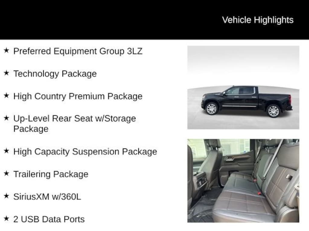 10-Way Power Driver Seat w/Lumbar, 10-Way Power Passenger Seat Adjuster w/Lumbar, 12.3 Multicolor Reconfigurable Digital Display, 120-Volt Bed Mounted Power Outlet, 120-Volt Interior Power Outlet, 15 Diagonal Multicolor Head-Up Display, 2 USB Data Ports, 2nd Row Heated Outboard Seats, Adaptive Cruise Control, All-Weather Floor Liner (LPO), Auto-Dimming Inside Rear-View Mirror, Auto-Locking Rear Differential, Bed View Camera, Bluetooth® For Phone, Body-Color Painted Mirror Caps, Chevrolet Connected Access Capable, Chevytec Spray-On Black Bedliner, Chrome Assist Steps, Chrome Recovery Hooks, Color-Keyed Carpeting Floor Covering, Deep-Tinted Glass, Driver Memory, Dual Exhaust w/Polished Outlets, Dual Rear USB Ports (Charge Only), Electric Rear-Window Defogger, Electrical Steering Column Lock, Floor Mounted Center Console, Front Carpeted Floor Mats, Front LED Fog Lamps, Front Rain-Sensing Wipers, HD Surround Vision, Heated Driver & Front Outboard Passenger Seats, Heated Steering Wheel, High Capacity Suspension Package, High Country Premium Package, Hitch Guidance, Hitch Guidance w/Hitch View, In-Vehicle Trailering System App, Integrated Trailer Brake Controller, Keyless Open & Start, LED Cargo Area Lighting, OnStar & Chevrolet Connected Services Capable, Outside Heated Power-Adjustable Mirrors, Perimeter Lighting, Power Front Passenger Windows w/Express Up/Down, Power Front Windows w/Driver Express Up/Down, Power Rear Windows w/Express Down, Power Sliding Rear Window w/Rear Defogger, Power Sunroof, Power Tailgate, Power Tilt & Telescoping Steering Column, Preferred Equipment Group 3LZ, Rear Camera Mirror, Rear Carpeted Floor Mats, Rear Cross Traffic Braking, Rear Pedestrian Alert, Rear Wheelhouse Liners, Remote Vehicle Starter System, Safety Alert Seat, SiriusXM w/360L, Standard Tailgate, Steering Wheel Audio Controls, Technology Package, Theft Deterrent System (Unauthorized Entry), Trailer Camera Provisions, Trailer Side Blind Zone Alert, Trailering Package, Ultrasonic Front & Rear Park Assist, Universal Home Remote, Up-Level Rear Seat w/Storage Package, Ventilated Driver & Front Passenger Seats, Wheels: 22 x 9 Painted Aluminum, Wi-Fi Hot Spot Capable, Wrapped Steering Wheel.