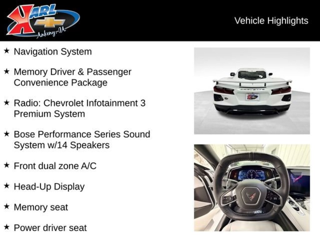 At Karl Chevrolet we want to help you find the best new or used car in Ankeny that suits your needs. Check out the 2025 Chevrolet Corvette For Sale in Ankeny, IA. When you buy a new car at Karl Chevrolet you know you're finding a vehicle you can rely on. We have a great selection of Platinum Quality Pre-Owned Vehicles. We also pride ourselves in creating a friendly atmosphere and reliable new car dealership that you can trust. Call us with any questions about our 2025 Chevrolet Corvette and our experts will be glad to help you! (515) 299-4300. *Equipment and options are generated by a 3rd party vendor, exact vehicle options may vary. Please see a salesperson for complete details and vehicle information.