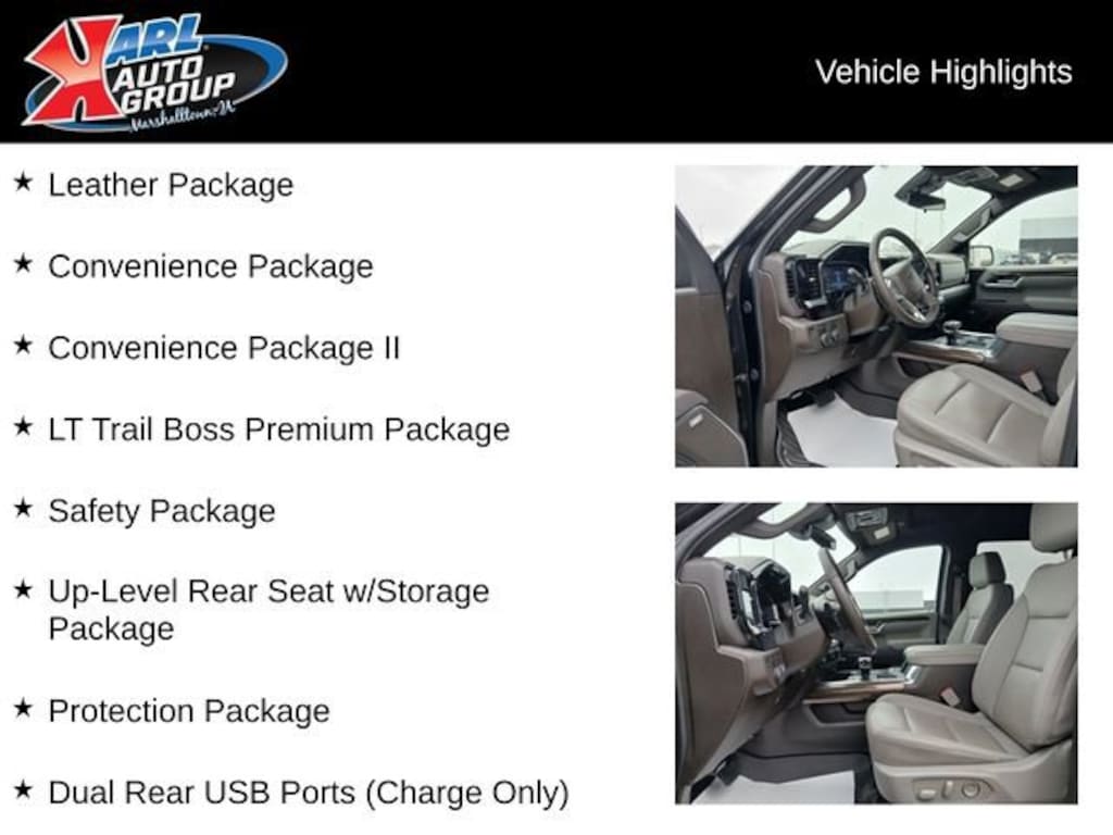 Certified. CARFAX One-Owner. Clean CARFAX. Black 2025 Chevrolet Silverado 1500 4D Crew Cab LT Trail Boss 3.0L I6 8-Speed Automatic 4WD, Gideon/Very Dark Atmosphere Leather, 10-Way Power Driver Seat w/Lumbar, 120-Volt Bed Mounted Power Outlet, 120-Volt Interior Power Outlet, Chevytec Spray-On Black Bedliner, Convenience Package, Convenience Package II, Dual Rear USB Ports (Charge Only), Dual-Zone Automatic Climate Control, Electric Rear-Window Defogger, HD Surround Vision, Heated Driver & Front Outboard Passenger Seats, Heated Steering Wheel, Hitch Guidance w/Hitch View, In-Vehicle Trailering System App, Keyless Open & Start, Leather Package, Leather-Appointed Front Seat Trim, LED Cargo Area Lighting, LT Trail Boss Premium Package, Manual Tilt/Telescoping Steering Column, Perimeter Lighting, Power Sliding Rear Window w/Rear Defogger, Power Tailgate, Premium Bose 7-Speaker Sound System, Protection Package, Rear Cross Traffic Braking, Rear Pedestrian Alert, Rear Wheelhouse Liners, Remote Vehicle Starter System, Safety Package, Theft Deterrent System (Unauthorized Entry), Trailer Camera Provisions, Trailer Side Blind Zone Alert, Ultrasonic Front & Rear Park Assist, Universal Home Remote, Up-Level Rear Seat w/Storage Package, Wrapped Steering Wheel.
