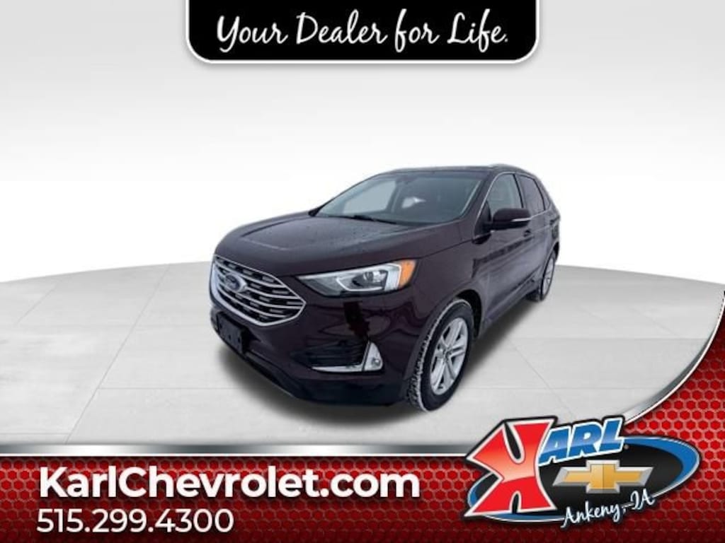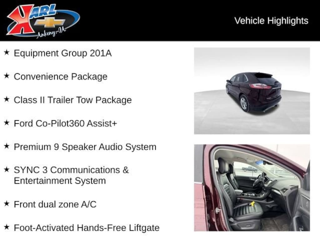 Recent Arrival! CARFAX One-Owner. Certified. Burgundy 2019 Ford Edge SEL SEL AWD EcoBoost 2.0L I4 GTDi DOHC Turbocharged VCT AWD, 110V/150W AC Power Outlet, 2 Driver Configurable 4.2 Color LCD Displays, ActiveX Seating Material Heated Bucket Seats, Adaptive Cruise Control w/Stop & Go, AppLink/Apple CarPlay and Android Auto, Auto High-beam Headlights, Class II Trailer Tow Package, Convenience Package, Equipment Group 201A, Evasive Steering Assist, Foot-Activated Hands-Free Liftgate, Ford Co-Pilot360 Assist+, Front dual zone A/C, Lane Centering, LED Signature Daytime Running Lamps, Perimeter Alarm, Power driver seat, Premium 9 Speaker Audio System, Rain sensing wipers, Rear Parking Sensors, Remote Start System, SiriusXM Traffic & Travel Link, SYNC 3 Communications & Entertainment System, Universal Garage Door Opener (UGDO), Voice-Activated Touchscreen Navigation System, Wireless Charging Pad. 21/28 City/Highway MPG 8-Speed Automatic AWDAt Karl Chevrolet we want to help you find the best new or used car in Ankeny that suits your needs. Check out the 2019 Ford Edge For Sale in Ankeny, IA. When you buy a new car at Karl Chevrolet you know you're finding a vehicle you can rely on. We have a great selection of Platinum Quality Pre-Owned Vehicles. We also pride ourselves in creating a friendly atmosphere and reliable new car dealership that you can trust. Call us with any questions about our 2019 Ford Edge and our experts will be glad to help you! (515) 299-4300. *Equipment and options are generated by a 3rd party vendor, exact vehicle options may vary. Please see a salesperson for complete details and vehicle information.Certification Program Details: Karl Chevrolet of Ankeny, The Nation's #1 CarBravo certified dealer, where platinum quality vehicles and unmatched benefits come together! This vehicle qualifies for our CarBravo Certified program reserved for the highest-quality pre-owned vehicles that are 10 model years or newer and have less than 100,000 miles. Every CarBravo Certified vehicle includes: ? Comprehensive 126-Point Inspection Professionally inspected by factory-trained technicians to meet strict mechanical, safety, and cosmetic standards. ? 6-Month / 6,000-Mile Bumper-to-Bumper Limited Warranty Enjoy added peace of mind with extensive coverage from the day you drive off the lot. ? 24/7 Roadside Assistance & Courtesy Transportation Flat tire? Dead battery? Need a tow? You're covered anywhere, anytime throughout the warranty period. ? Vehicle History & Title Guarantee Clean title, completed safety recalls, and a full CARFAX® or AutoCheck® report provided for complete transparency. ? 10-Day / 500-Mile Exchange Promise If you donât absolutely love it, bring it back and exchange it no hassle, no stress. Experience peace of mind and premium protection exclusively from Karl Chevrolet of Ankeny, the Nation's #1 CarBravo Certified Deale