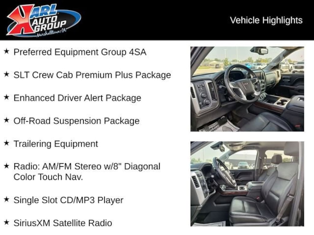 8-Speed Automatic with Overdrive, 4WD, Jet Black Leather, 10-Way Power Driver's Seat Adjuster, 110-Volt AC Power Outlet, 150 Amp Alternator, 1st & 2nd Row Color-Keyed Carpeted Floor Mats, 2-Speed Active Electronic AutoTrac Transfer Case, 20 x 9 Chrome Clad Aluminum Wheels, 4.2 Diagonal Color Display Driver Info Center, 6-Speaker Audio System, 6 Rectangular Chromed Tubular Assist Steps, Auto-Dimming Inside Rear-View Mirror, Auxiliary External Transmission Oil Cooler, Chrome Bodyside Moldings, Chrome Door Handles, Chrome Mirror Caps, Color-Keyed Carpeting, Deep-Tinted Glass, Driver & Front Passenger Illuminated Vanity Mirrors, Dual-Zone Automatic Climate Control, Electric Rear-Window Defogger, Enhanced Driver Alert Package, EZ Lift & Lower Tailgate, Floor Mounted Console, Forward Collision Alert, Front Frame-Mounted Black Recovery Hooks, Front Full Feature Power Reclining Bucket Seats, HD Radio, Heated & Ventilated Front Bucket Seats, Heated Driver & Front Passenger Seats, Heavy-Duty Rear Locking Differential, High-Performance LED Headlamps, Hill Descent Control, Integrated Trailer Brake Controller, IntelliBeam Automatic High Beam On/Off Headlight, Lane Keep Assist, Leather Wrapped Heated Steering Wheel, Leather Wrapped Steering Wheel w/Cruise Controls, LED Cargo Box Lighting, LED Tailamps w/Signature, Low Speed Forward Automatic Braking, Manual Tilt/Telescoping Steering Column, Off-Road Suspension Package, OnStar 3 Month Guidance Plan, OnStar w/4G LTE, Power Adjustable Pedals, Power Folding & Adjustable Heated Outside Mirrors, Power Sliding Rear Window w/Defogger, Power Windows w/Driver Express Up & Down, Preferred Equipment Group 4SA, Radio: AM/FM Stereo w/8 Diagonal Color Touch Nav., Rear 60/40 Folding Bench Seat (Folds Up), Rear Vision Camera, Rear Wheelhouse Liners, Remote Keyless Entry, Remote Locking Tailgate, Remote Vehicle Starter System, Single Slot CD/MP3 Player, SiriusXM Satellite Radio, SLT Crew Cab Premium Plus Package, Spray-On Pickup Box Bed Liner w/GMC Logo, Steering Wheel Audio Controls, Theft Deterrent System (Unauthorized Entry), Thin Profile LED Fog Lamps, Trailering Equipment, Ultrasonic Front & Rear Park Assist, Universal Home Remote, Wireless Charging.