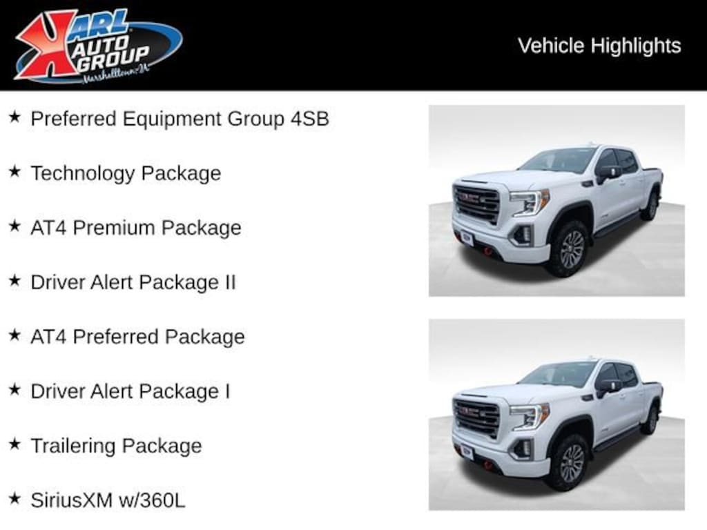 Recent Arrival! Certified. Clean CARFAX. Summit White 2021 GMC Sierra 1500 4D Crew Cab AT4 3.0L I6 22/26 City/Highway MPG 10-Speed Automatic 4WD, Jet Black With Kalahari Accents Leather, 12-Volt Rear Auxiliary Power Outlet, 120-Volt Bed Mounted Power Outlet, 120-Volt Instrument Panel Power Outlet, 2 USB Ports, 2 USB Ports (1st Row), 4.2 Diagonal Color Display Driver Info Center, 4G LTE Wi-Fi Hotspot Capable, 8 Driver Information Center, Adaptive Cruise Control, AT4 High Clearance Step (LPO), AT4 Preferred Package, AT4 Premium Package, Auto-Locking Rear Differential, Automatic Emergency Braking, Auxiliary External Transmission Oil Cooler, Bed View Camera, Body-Color Surround Grille, Color-Keyed Carpeting Floor Covering, Compass, Deep-Tinted Glass, Driver Alert Package I, Driver Alert Package II, Electric Rear-Window Defogger, Electrical Lock Control Steering Column, Floor-Mounted Center Console, Following Distance Indicator, Forward Collision Alert, Front Pedestrian Braking, Front Prem Floor Liners w/Removable Carpet Insert, GMC Connected Access Capable, HD Rear Vision Camera, HD Surround Vision w/2 Trailer View Camera Provisions, Heated Driver & Front Outboard Passenger Seating, Heavy-Duty Air Filter, Hill Descent Control, Hitch Guidance, Hitch Guidance w/Hitch View, In-Vehicle Trailering App, Integrated Trailer Brake Controller, IntelliBeam Automatic High Beam On/Off, Keyless Open & Start, Lane Change Alert w/Side Blind Zone Alert, Lane Keep Assist w/Lane Departure Warning, LED Cargo Area Lighting, Manual Tilt-Wheel & Telescoping Steering Column, Multicolor 15 Diagonal Head-Up Display, OnStar & GMC Connected Services Capable, Perimeter Lighting, Power Door Locks, Power Front Passenger Windows w/Express Up/Down, Power Front Windows w/Driver Express Up/Down, Power Rear Windows w/Express Down, Power Sliding Rear Window w/Rear Defogger, Preferred Equipment Group 4SB, Premium Bose 7-Speaker Sound System, ProGrade Trailering System, Radio: Premium GMC Infotainment Sys w/Navigation, Rear Camera Mirror, Rear Cross Traffic Alert, Rear Dual USB Charging-Only Ports, Rear Prem Floor Liners w/Removable Carpet Insert, Rear Wheelhouse Liners, Red Recovery Hooks, Remote Vehicle Starter System, Safety Alert Seat, SiriusXM w/360L, Spray-On Pickup Bed Liner w/AT4 Logo, Steering Wheel Audio Controls, Technology Package, Theft Deterrent System (Unauthorized Entry), Trailering Package, Ultrasonic Front & Rear Park Assist, Universal Home Remote, Ventilated Driver & Front Passenger Seats, Wireless Charging.Certification Program Details: Karl of Marshalltown, your newest CarBravo certified dealer, where platinum quality vehicles and unmatched benefits come together! ?? Rigorous Inspection Undergoes a focused inspection to verify key systems, giving you added peace of mind. ?? Limited Powertrain Warranty Includes a standard 30-day / 1,000-mile Powertrain Limited Warranty, covering engine, transmission, drive system and more. ?? Vehicle History Review Comes with a full car history report so you can verify the past and condition of the vehicle. ?? Roadside Assistance & Courtesy Transportation Coverage for the warranty period, including roadside support and alternative transportation if needed. CarBravo ? 10-Day / 500-Mile Exchange Option If for any reason the vehicle isn't the right fit, you have an exchange window (check specific dealership policy). Affordable, Certified, Reliable. The BravoBudget label means you're getting a thoughtfully selected vehicle that meets higher mileage or slightly older model criteria but still backed by the CarBravo process and protections.
