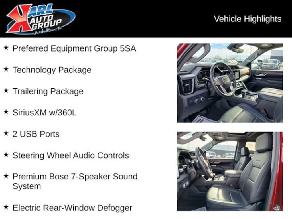 Recent Arrival! Certified. CARFAX One-Owner. Volcanic Red Tintcoat 2023 GMC Sierra 1500 4D Crew Cab Denali EcoTec3 6.2L V8 15/19 City/Highway MPG 10-Speed Automatic 4WD, Jet Black Leather, 120-Volt Bed Mounted Power Outlet, 120-Volt Instrument Panel Power Outlet, 170 Amp Alternator, 2 Charge/Data USB Ports Inside Center Console, 2 Type-C Charge-Only Rear USB Ports, 2 USB Ports, Adaptive Cruise Control, Auto-Locking Rear Differential, Auxiliary External Transmission Oil Cooler, Bed View Camera, Chrome Header w/Signature Denali Chrome Grille, Chrome Recovery Hooks, Chrome Wheel To Wheel Assist Steps, Color-Keyed Carpeting Floor Covering, Compass, Deep-Tinted Glass, Electric Rear-Window Defogger, Electrical Steering Column Lock, Floor-Mounted Center Console, Front Rainsensing Wipers, GMC Connected Access Capable, HD Surround Vision, Heated 2nd Row Outboard Seats, Heated Driver & Front Outboard Passenger Seating, Heavy-Duty Air Filter, Hill Descent Control, Hitch Guidance, Hitch Guidance w/Hitch View, In-Vehicle Trailering App, Integrated Trailer Brake Controller, Keyless Open & Start, LED Cargo Area Lighting, Multicolor 15 Diagonal Head-Up Display, OnStar & GMC Connected Services Capable, Perimeter Lighting, Power Door Locks, Power Front Passenger Windows w/Express Up/Down, Power Front Windows w/Driver Express Up/Down, Power Rake & Telescoping Steering Column, Power Rear Windows w/Express Down, Power Sliding Rear Window w/Rear Defogger, Preferred Equipment Group 5SA, Premium Bose 7-Speaker Sound System, Push Button Start, Rear Camera Mirror, Rear Cross Traffic Braking, Rear Pedestrian Detection, Rear Wheelhouse Liners, Remote Vehicle Starter System, SiriusXM w/360L, Spray-On Pickup Bed Liner w/Denali Logo, Steering Wheel Audio Controls, Technology Package, Theft Deterrent System (Unauthorized Entry), Trailer Camera Provisions, Trailer Side Blind Zone Alert, Trailering Package, Ultrasonic Front & Rear Park Assist, Universal Home Remote, Ventilated Driver & Front Passenger Seats, Wi-Fi Hotspot Capable, Wireless Charging, Wireless Phone Projection.