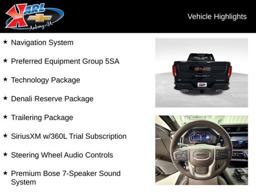 Step inside the cabin, and you'll be greeted by a world of unparalleled comfort and technology. The Denali Reserve Package equips this Sierra with a host of premium features, including a Bose 7-speaker sound system, wireless charging, and a 15-inch head-up display. The heated and ventilated front seats, along with the heated rear seats, ensure that every passenger enjoys a relaxing ride.