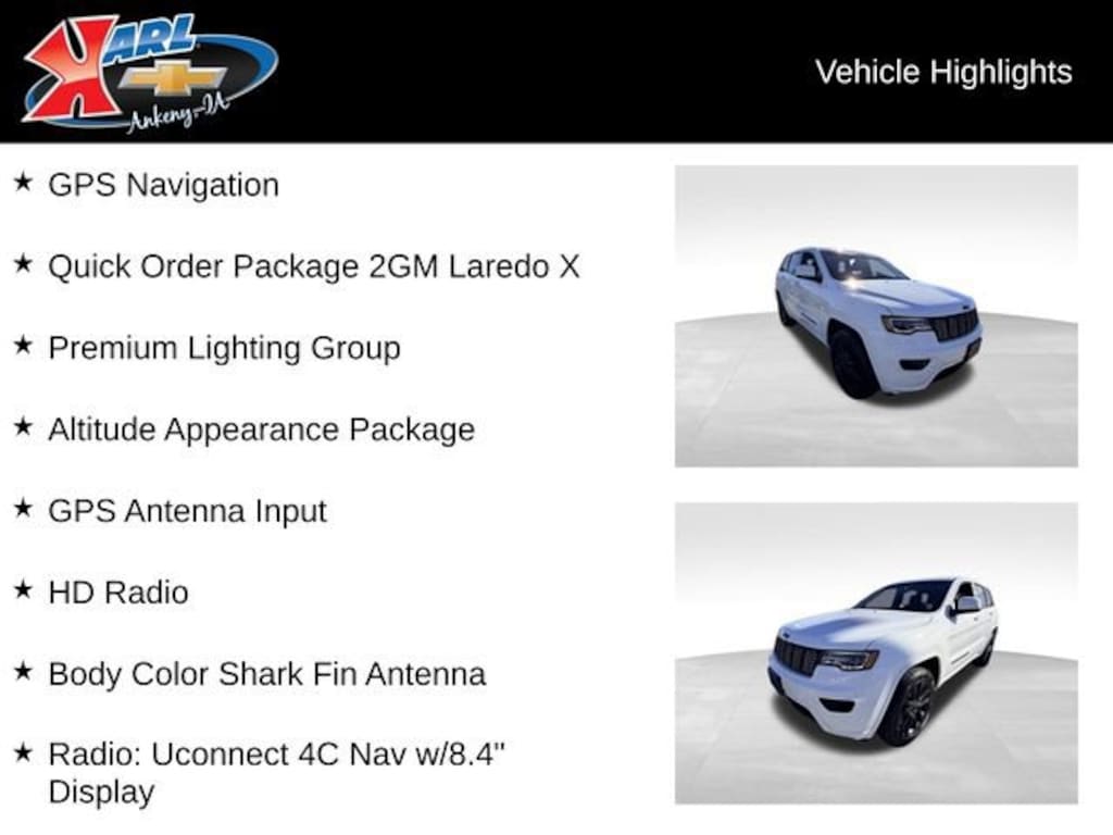 Recent Arrival! CARFAX One-Owner! Clean CARFAX. Certified. Bright White Clearcoat 2021 Jeep Grand Cherokee Laredo X LAREDO X 4X4 3.6L V6 24V VVT 4WD, 4G LTE Wi-Fi Hot Spot, 8.4 Touchscreen Display, Altitude Appearance Package, Altitude Grille, Apple CarPlay/Android Auto, Bi-Xenon High-Intensity Discharge Headlamps, Black Roof Molding, Black Suede Seats w/Black Stitching, Body Color Claddings, Body Color Fascia, Body Color Shark Fin Antenna, Bridgestone Brand Tires, Dark Day Light Opening Moldings, Dark Headlamp Bezel Finish, Dark Lens Taillamps, Delete Laredo Badge, Front Accent/Body Color Fascia, Front dual zone A/C, Front LED Fog Lamps, Gloss Black Jeep Badging, Gloss Black Rear Fascia Applique, Google Android Auto, GPS Antenna Input, GPS Navigation, HD Radio, Heated Front Seats, Heated Steering Wheel, Instrument Cluster w/Off-Road Disp. Pages, Integrated Voice Command w/Bluetooth, LED Daytime Running Headlamps, ParkView Rear Back-Up Camera, Power driver seat, Power Liftgate, Premium Lighting Group, Quick Order Package 2GM Laredo X, Radio: Uconnect 4C Nav w/8.4 Display, Rear Accent/Body Color Fascia, Rear Fascia Black Molded in Color Step Pad, Rear window wiper, Remote Start System, Security Alarm, Single Exhaust w/Bright Tip, Steering Wheel Mounted Audio Controls, Universal Garage Door Opener, Wheels: 20 x 8.0 Gloss Black Aluminum. 18/25 City/Highway MPG 8-Speed Automatic 4WD