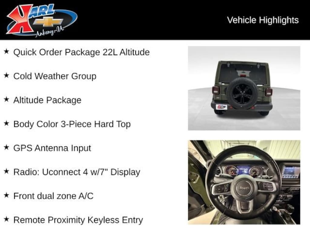 At Karl Chevrolet we want to help you find the best new or used car in Ankeny that suits your needs. Check out the 2021 Jeep Wrangler For Sale in Ankeny, IA. When you buy a new car at Karl Chevrolet you know you're finding a vehicle you can rely on. We have a great selection of Platinum Quality Pre-Owned Vehicles. We also pride ourselves in creating a friendly atmosphere and reliable new car dealership that you can trust. Call us with any questions about our 2021 Jeep Wrangler and our experts will be glad to help you! (515) 299-4300. *Equipment and options are generated by a 3rd party vendor, exact vehicle options may vary. Please see a salesperson for complete details and vehicle information.
