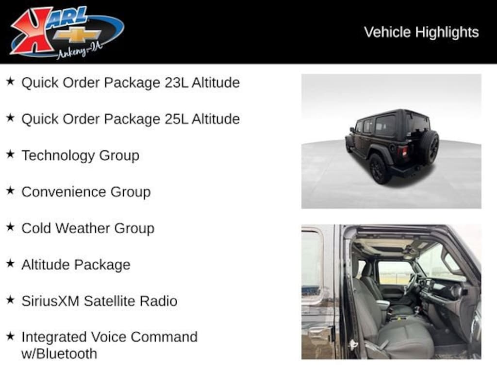 The Wrangler's impressive list of features includes the Altitude Package, which adds premium touches like a body-colored grille, black interior accents, and a premium-wrapped steering wheel. The Cold Weather Group keeps you comfortable in any climate with heated front seats and a heated steering wheel. The Technology Group brings advanced connectivity and convenience features like automatic climate control, a 7-inch digital display, and SiriusXM satellite radio.