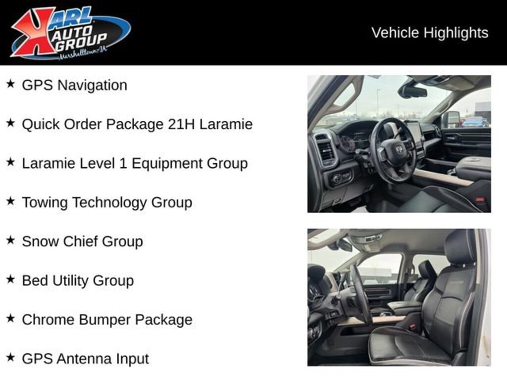 Recent Arrival! Certified. CARFAX One-Owner. Clean CARFAX. Bright White Clearcoat 2024 Ram 3500 4D Mega Cab Laramie 6.7L I6 Aisin 6-Speed Automatic 4WD ,12 Touchscreen Display, 18 x 8 Polished Aluminum Wheels, 4G LTE Wi-Fi Hot Spot, Alexa Built-In, Apple CarPlay, Auto Adjust In Reverse Exterior Mirrors, Auto Dim Exterior Mirror, Auto Dimming Exterior Passenger Mirror, Auto High Beam Headlamp Control, Auto Power-Folding Mirrors, Auxiliary Switches Prep, Bed Utility Group, Blind Spot & Cross Path Detection, Bright Front Bumper, Bright Rear Bumper, Center Hub, Center Stop Lamp w/Cargo View Camera, Chrome Bumper Package, Clearance Lamps, Connected Travel & Traffic Services, Connectivity - US/Canada, Dash Pass Thru Wire Circuits, Disassociated Touchscreen Display, Exterior Mirrors Courtesy Lamps, Exterior Mirrors w/Heating Element, Exterior Mirrors w/Memory, Exterior Mirrors w/Supplemental Signals, Foam Bottle Insert (Door Trim Panel), For Details Visit DriveUconnect.com, For More Info, Call 800-643-2112, Forward & Reverse Utility Lights, Front LED Fog Lamps, Global Telematics Box Module (TBM), Google Android Auto, GPS Antenna Input, GPS Navigation, HD Radio, I/P Mounted Auxiliary Switches, Integrated Voice Command w/Bluetooth, Laramie Level 1 Equipment Group, LED Bed Lighting, LED Reflector Headlamps, LED Tail Lamps, Mirror Running Lights, MOPAR Deployable Bed Step, MOPAR Spray In Bedliner, Off-Road Information Pages, ParkSense Front/Rear Park Assist System, Power Adjust Mirrors, Power Adjustable Pedals w/Memory, Power Heated Folding Telescopic Mirrors w/Memory, Power Telescoping Mirrors, Power-Adjustable Convex Aux Mirrors, Quick Order Package 21H Laramie, Radio: Uconnect 5 Nav w/12.0 Display, Rain Sensitive Windshield Wipers, Rear Power Sliding Window, Rear Window Defroster, Remote Tailgate Release, Selectable Tire Fill Alert, SiriusXM Radio Service, SiriusXM w/360L, Snow Chief Group, Surround View Camera System, Towing Technology Group, Trailer Reverse Guidance, Trailer Tow Pages.