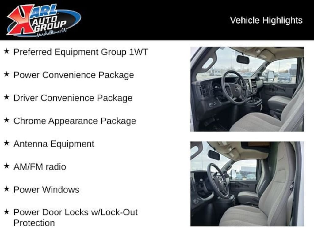 AM/FM radio, Antenna Equipment, Bluetooth Phone Connection Kit (LPO), Chrome Appearance Package, Chrome Grille, Cruise Control, Driver & Front Passenger High-Back Bucket Seats, Driver Convenience Package, Driver's Seat Mounted Armrest, Dual front impact airbags, Dual rear wheels, Electronic Stability Control, Engine Cover Console w/Swing-Out Storage Bin, Front Bucket Seats, Front Chrome Bumper w/Step-Pad, Front wheel independent suspension, Heavy-Duty Locking Rear Differential, Inside Rearview Mirror w/Rr Vision Camera Display, Occupant sensing airbag, Passenger cancellable airbag, Power Convenience Package, Power Door Locks w/Lock-Out Protection, Power Windows, Preferred Equipment Group 1WT, Rear Vision Camera, Reclining High-Back Bucket Seats w/Inboard Armrests, Tilt Steering Wheel, Wheels: 16 x 6.5 8-Lug Painted Steel HD (6).The dealer has added these accessories to this vehicle:- 23221 ($20,670) Rockport 16'L X 96W X 78H Cargoport, with Bulkhead sliding door, rear twin swing doors, Aluminum Shelving see dealer for more detailsSummit White 2025 GMC Cutaway Van Savana 3500 Work Van 6.6L V8 8-Speed Automatic RWDWhen you buy a new car at Karl or Marshalltown you know you're finding a vehicle you can rely on. We have a great selection of new vehicles for you to test drive around Newton and Des Moines, IA. We also pride ourselves in creating a friendly atmosphere and reliable new car dealership that you can trust. Call us with any questions about our 2025 GMC Savana 3500 and our experts will be glad to help you! (641) 752-7101. *Equipment and options are generated by a 3rd party vendor, exact vehicle options may vary. Please see a salesperson for complete details and vehicle information.