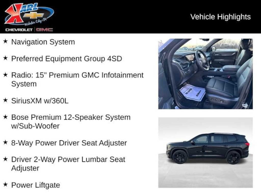 Inside, the Acadia Elevation pampers you with a wealth of premium features, including the Bose Premium 12-Speaker System, Heated Front Seats, and an intuitive 15 Premium GMC Infotainment System with Apple CarPlay and Android Auto integration. The 8-Passenger Seating Configuration and Split Folding Rear Seat offer unparalleled versatility, allowing you to accommodate passengers and cargo with ease.
