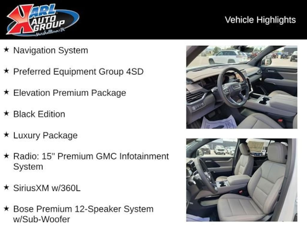 AWD, Gray Cloth, 2-Way Driver Power Lumbar Seat Adjuster, 3-Channel Programmable Universal Home Remote, 3rd row seats: split-bench, 4-Way Manual Front Passenger Seat Adjuster, 6-Way Power Front Passenger Seat Adjuster, 7-Passenger Seating (2-2-3 Seating Configuration), 8-Passenger Seating (2-3-3 Seating Configuration), 8-Way Power Driver Seat Adjuster, 8 Diagonal Head-Up Display, AM/FM radio: SiriusXM with 360L, Automatic temperature control, Black Edition, Bose Premium 12-Speaker System w/Sub-Woofer, Brake assist, Cloth Seat Trim, Compass, CoreTec Seat Trim, Delay-off headlights, Dual front impact airbags, Dual front side impact airbags, Electronic Stability Control, Elevation Premium Package, Exterior Parking Camera Rear, Front & Rear Black GMC Emblems (LPO), Front anti-roll bar, Front Bucket Seats, Front dual zone A/C, Front License Plate Bracket, Front Passenger Power Lumbar Seat Adjuster, Front reading lights, Fully automatic headlights, Gloss Black Roof Rails, Heated Driver & Front Passenger Seats, Heated Rear Outboard Seating Positions, Heated steering wheel, Heated Wiper Park, High Gloss Black Door Upper Molding, Laminated Acoustic Glass, Low tire pressure warning, Luxury Package, Navigation System, Occupant sensing airbag, Passenger vanity mirror, Power driver seat, Power Liftgate, Power steering, Power windows, Preferred Equipment Group 4SD, Radio data system, Radio: 15 Premium GMC Infotainment System, Rear air conditioning, Rear anti-roll bar, Rear reading lights, Rear seat center armrest, Rear window wiper, SiriusXM w/360L, Sport steering wheel, Steering wheel mounted audio controls, Tilt steering wheel, Wheels: 22 x 8.5 Gloss Black Aluminum.
