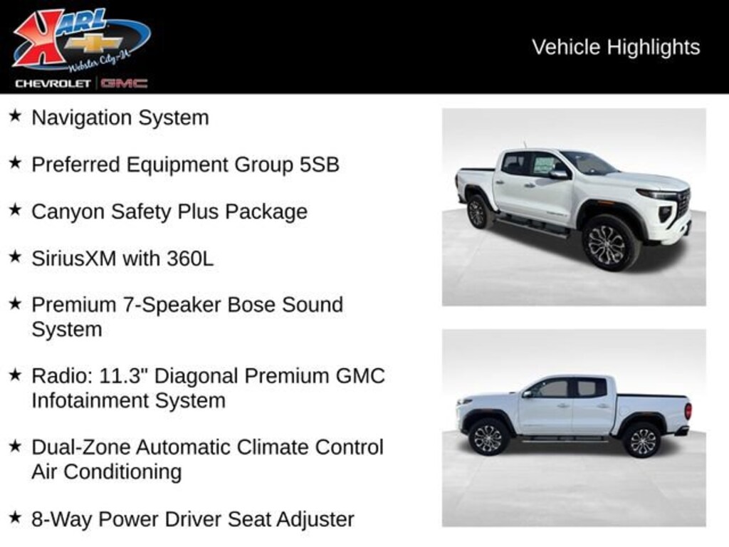 Safety is paramount in the Canyon Denali, with features like Automatic Emergency Braking, Front Pedestrian and Bicyclist Braking, and the innovative Safety Alert Seat keeping you and your loved ones secure on the road.