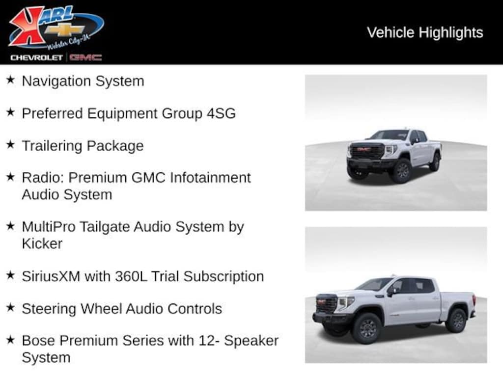 At Karl Chevrolet/GMC we want to help you find the best new or used car in Webster City that suits your needs. When you buy a new car at Karl Chevrolet/GMC you know you're finding a vehicle you can rely on. We have a great selection of CarBravo Quality Pre-Owned Vehicles. We also pride ourselves in creating a friendly atmosphere and a reliable Dealership that you can trust. Call us and our experts will be glad to help you! (515) 209-7117. *Equipment and options are generated by a 3rd party vendor, exact vehicle options may vary. Please see a salesperson for complete details and vehicle information. Price includes: $1500 - Buick GMC Bonus Cash. Exp. 04/30/2026 $1750 - Buick & GMC Consumer Cash Program. Exp. 04/30/2026