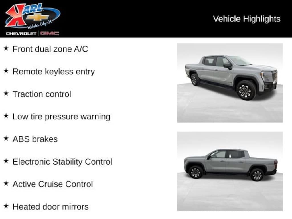 ABS brakes, Active Cruise Control, Alloy wheels, Electronic Stability Control, Front dual zone A/C, Heated door mirrors, Heated front seats, Low tire pressure warning, Remote keyless entry, Traction control. Gray 2026 GMC Sierra EV 3SB ELEVATION 4D Crew Cab Electric Motor 74/60 City/Highway MPG 1-Speed Automatic AWD