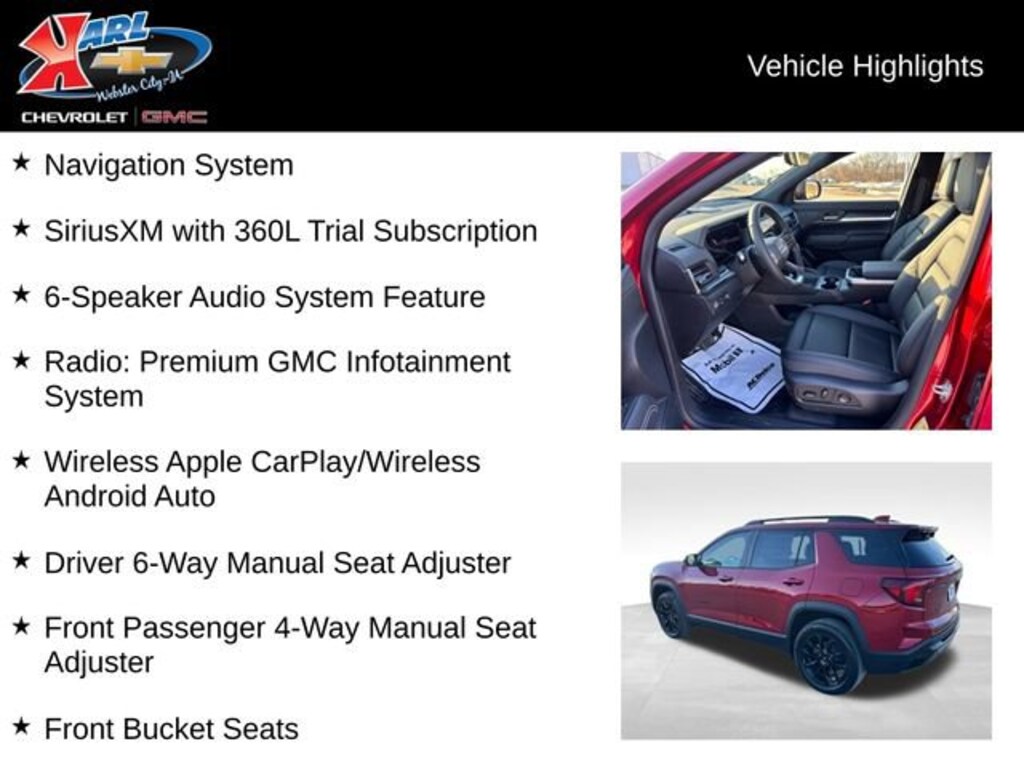Elevate your style with the Terrain Elevation's striking Red exterior, complemented by a host of premium features that elevate your driving experience. Enjoy the convenience of the Navigation System, the clarity of the 6-Speaker Audio System, and the seamless connectivity of Wireless Apple CarPlay and Android Auto. Stay informed and entertained with the Premium GMC Infotainment System and the SiriusXM with 360L Trial Subscription.