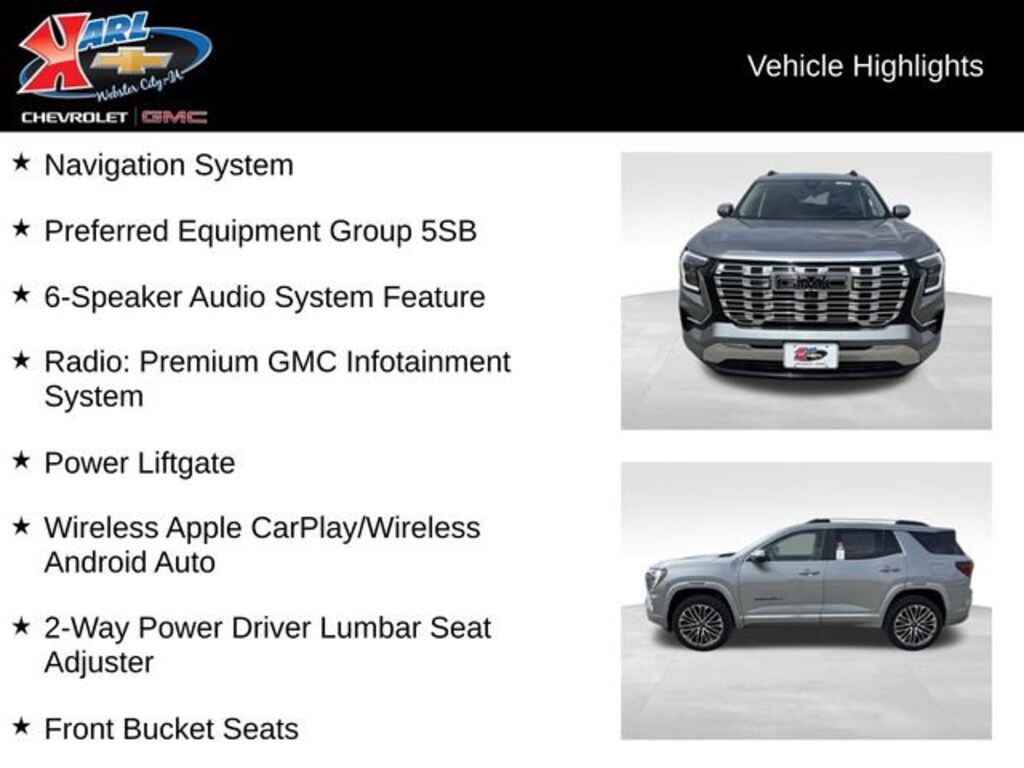At Karl Chevrolet/GMC we want to help you find the best new or used car in Webster City that suits your needs. When you buy a new car at Karl Chevrolet/GMC you know you're finding a vehicle you can rely on. We have a great selection of CarBravo Quality Pre-Owned Vehicles. We also pride ourselves in creating a friendly atmosphere and a reliable Dealership that you can trust. Call us and our experts will be glad to help you! (515) 209-7117. *Equipment and options are generated by a 3rd party vendor, exact vehicle options may vary. Please see a salesperson for complete details and vehicle information. Price includes: $1000 - Buick GMC Bonus Cash. Exp. 04/30/2026