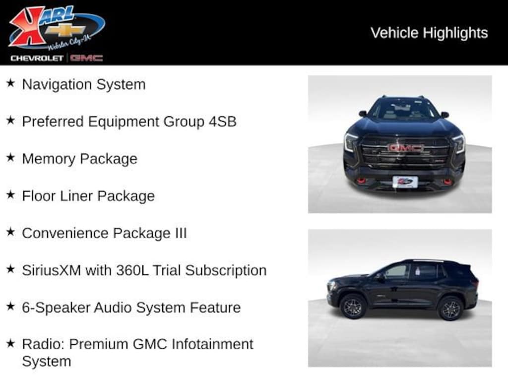 At Karl Chevrolet/GMC we want to help you find the best new or used car in Webster City that suits your needs. When you buy a new car at Karl Chevrolet/GMC you know you're finding a vehicle you can rely on. We have a great selection of CarBravo Quality Pre-Owned Vehicles. We also pride ourselves in creating a friendly atmosphere and a reliable Dealership that you can trust. Call us and our experts will be glad to help you! (515) 209-7117. *Equipment and options are generated by a 3rd party vendor, exact vehicle options may vary. Please see a salesperson for complete details and vehicle information. Price includes: $1000 - Buick GMC Bonus Cash. Exp. 04/30/2026