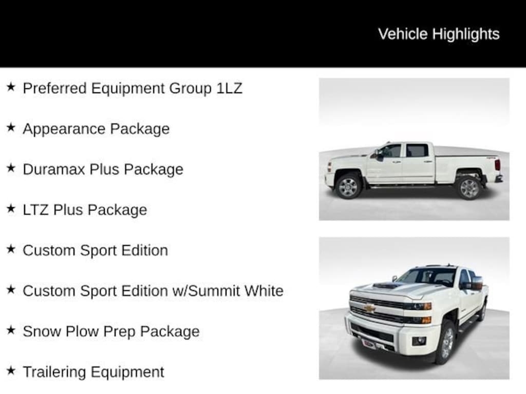 Certified.Summit White LTZ 4WD Duramax 6.6L V8 Turbodiesel110-Volt AC Power Outlet, 220 Amps Alternator, 4.2 Diagonal Color Display Driver Info Center, 6-Speaker Audio System, Appearance Package, Auto-Dimming Inside Rear-View Mirror, Body-Color Front Bumper, Body-Color Grille w/Chrome Bars, Body-Color Rear Bumper, Chrome Bodyside Moldings, Chrome Door Handles, Chrome Mirror Caps, Color-Keyed Carpeting Floor Covering, Custom Sport Edition, Custom Sport Edition w/Summit White, Deep-Tinted Glass, Digital Steering Assist, Driver & Front Passenger Vanity Mirror Visors, Dual-Zone Automatic Climate Control, Duramax Plus Package, Electric Rear-Window Defogger, Electronic Shift Transfer Case, Engine Block Heater, EZ-Lift & Lower Tailgate, Front Halogen Fog Lamps, HD Radio, Heated Leather Wrapped Steering Wheel, Heated Power-Adjustable Outside Mirrors, Integrated Trailer Brake Controller, Leather-Wrapped Steering Wheel, LTZ Plus Package, Manual Tilt-Wheel/Telescoping Steering Column, OnStar 3 Month Guidance Plan, OnStar 4G LTE Wi-Fi Hotspot, Power Sliding Rear Window w/Defogger, Power Windows w/Driver Express Up & Down, Power-Adjustable Pedals, Preferred Equipment Group 1LZ, Provision for Cab Roof-Mounted Lamp/Beacon, Radio: AM/FM Stereo w/Chevrolet MyLink/Navigation, Rear 60/40 Folding Bench Seat (Folds Up), Rear Vision Camera, Rear Wheelhouse Liners, Remote Keyless Entry, Remote Locking Tailgate, Remote Vehicle Starter System, Single Slot CD/MP3 Player, SiriusXM Satellite Radio, Snow Plow Prep Package, Spray-On Pickup Box Bed Liner w/Bowtie Logo, Standard Suspension Package, Steering Wheel Audio Controls, Trailering Equipment, Unauthorized Entry Theft-Deterrent System, Universal Home Remote, Wheels: 20 6-Spoke Polished Aluminum.Here at Karl Chevrolet of Stuart we want to help you find the best vehicle to suit your needs. With our huge selection of new and pre-owned vehicles, we're sure to have the right car for you! We pride ourselves on creating a friendly buying experience and earning the title of Your Dealer for Life. Give us a call at 515.523.1201 and speak to our experts to find out just how easy it is to get the vehicle of your dreams!*Equipment and options are generated by a 3rd party vendor, exact vehicle options may vary. Please see a salesperson for complete details and vehicle information.Odometer is 45883 miles below market average!Certification Program Details: Karl Chevrolet of Stuart, your newest CarBravo dealer, where platinum quality vehicles and unmatched benefits come together! -Comprehensive Limited Bumper to Bumper Warranty. -24/7 Roadside Assistance: -Multi-Point Vehicle Inspection: Every vehicle undergoes a Platinum Quality Certified Inspection known throughout the industry to ensure top quality. -Vehicle Exchange Program. Within 10-Days and 500 miles -Complimentary Vehicle History Report -Nationwide Dealer Network Support: Enjoy the backing of the extensive CarBravo and GM dealership network. -OnStar and SiriusXM Trials: Enjoy connected services and entertainment with included trial subscriptions. -Terms and conditions may apply. With every vehicle purchased, you'll enjoy the peace of mind that comes with a limited warranty, 24/7 roadside assistance, and a comprehensive vehicle inspection.Awards:* 2017 KBB.com 10 Most Awarded Brands