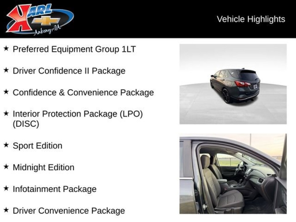 Recent Arrival! CARFAX One-Owner & Local Trade! Clean CARFAX. Certified. Nightfall Gray Metallic 2021 Chevrolet Equinox LT AWD 4DR LT W/1LT 1.5L DOHC AWD, 120-Volt Power Outlet, 2 USB Data Ports, 3-Spoke Leather-Wrapped Steering Wheel, All-Weather Floor Mats, Apple CarPlay/Android Auto, Auto High-beam Headlights, Bluetooth® For Phone, Cargo Mat, Confidence & Convenience Package, Dark Finish Fog Lamp Bezel Surround, Driver Confidence II Package, Driver Convenience Package, Dual Zone Automatic Climate Control, Front Fog Lamps, HD Rear Vision Camera, Heated Driver & Front Passenger Seats, Infotainment Package, Interior Protection Package (LPO) (DISC), Lane Change Alert w/Side Blind Zone Alert, Midnight Edition, Power driver seat, Preferred Equipment Group 1LT, Radio: Chevrolet Infotainment 3 Plus System w/Navi, Rear Cross Traffic Alert, Rear Park Assist w/Audible Warning, Rear Power Liftgate, Remote Start, Sport Edition, Unique Mold-In-Color Grille, Universal Home Remote, Wheels: 19 Gloss Black Aluminum. 25/30 City/Highway MPG 6-Speed Automatic Electronic with Overdrive AWDAt Karl Chevrolet we want to help you find the best new or used car in Ankeny that suits your needs. Check out the 2021 Chevrolet Equinox For Sale in Ankeny, IA. When you buy a new car at Karl Chevrolet you know you're finding a vehicle you can rely on. We have a great selection of Platinum Quality Pre-Owned Vehicles. We also pride ourselves in creating a friendly atmosphere and reliable new car dealership that you can trust. Call us with any questions about our 2021 Chevrolet Equinox and our experts will be glad to help you! (515) 299-4300. *Equipment and options are generated by a 3rd party vendor, exact vehicle options may vary. Please see a salesperson for complete details and vehicle information.Certification Program Details: Karl Chevrolet of Ankeny, The Nation's #1 CarBravo certified dealer, where platinum quality vehicles and unmatched benefits come together! This vehicle qualifies for our CarBravo Certified program reserved for the highest-quality pre-owned vehicles that are 10 model years or newer and have less than 100,000 miles. Every CarBravo Certified vehicle includes: ? Comprehensive 126-Point Inspection Professionally inspected by factory-trained technicians to meet strict mechanical, safety, and cosmetic standards. ? 6-Month / 6,000-Mile Bumper-to-Bumper Limited Warranty Enjoy added peace of mind with extensive coverage from the day you drive off the lot. ? 24/7 Roadside Assistance & Courtesy Transportation Flat tire? Dead battery? Need a tow? You're covered anywhere, anytime throughout the warranty period. ? Vehicle History & Title Guarantee Clean title, completed safety recalls, and a full CARFAX® or AutoCheck® report provided for complete transparency. ? 10-Day / 500-Mile Exchange Promise If you don't absolutely love it, bring it back and exchange it no hassle, no stress. Experience peace of mind and premium protection exclusively from Karl Chevrolet of Ankeny, the Nation's #1 CarBravo Certified Deale