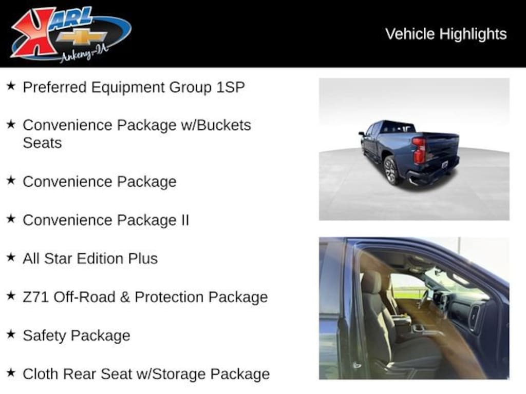 At Karl Chevrolet we want to help you find the best new or used car in Ankeny that suits your needs. When you buy a new car at Karl Chevrolet you know you're finding a vehicle you can rely on. We have a great selection of Platinum Quality Pre-Owned Vehicles. We also pride ourselves in creating a friendly atmosphere and a reliable Dealership that you can trust. Call us and our experts will be glad to help you! (515) 299-4300. *Equipment and options are generated by a 3rd party vendor, exact vehicle options may vary. Please see a salesperson for complete details and vehicle information.