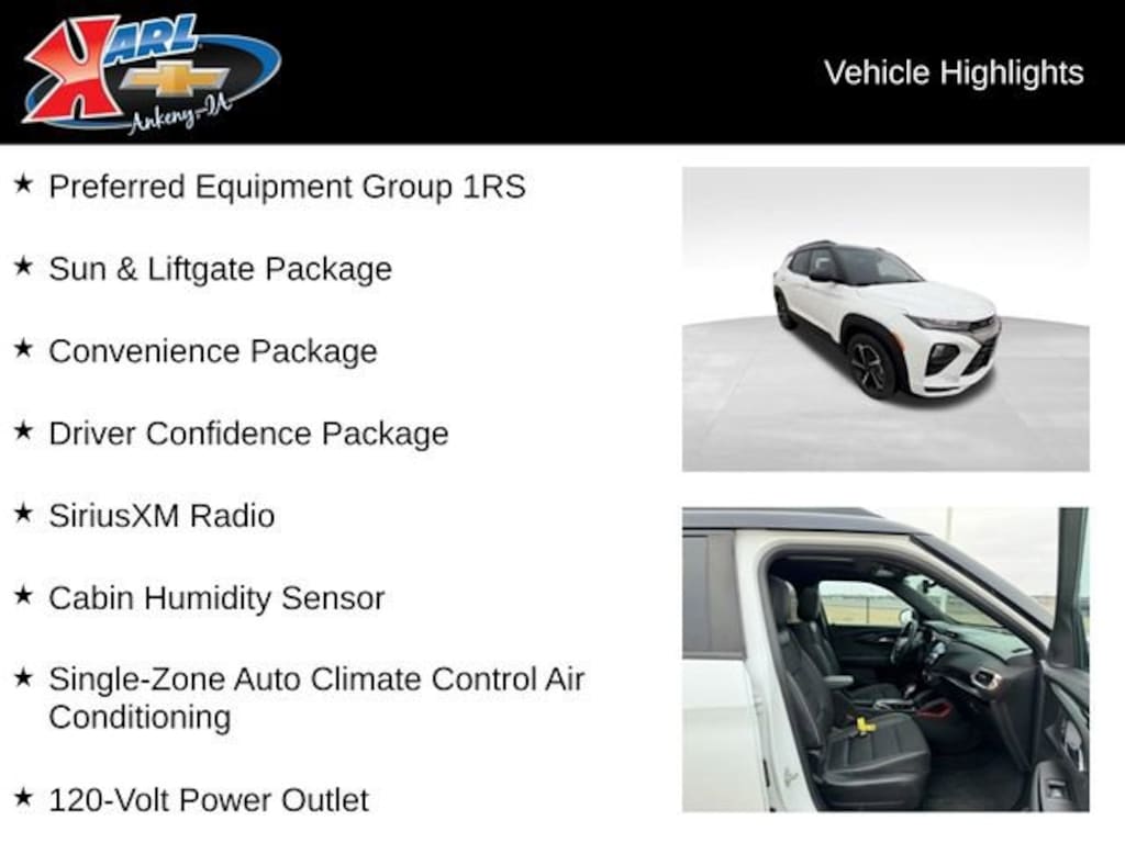 As a CarBravo Certified vehicle, this TrailBlazer has undergone a rigorous 126-point inspection by our factory-trained technicians, ensuring it meets the highest standards of quality and reliability. You can drive with confidence, knowing that this vehicle comes with a 12-month/12,000-mile bumper-to-bumper limited warranty, 24/7 roadside assistance, and a 10-day/500-mile exchange promise. Experience the difference of a truly exceptional pre-owned vehicle from Karl Chevrolet of Ankeny, the Nation's #1 CarBravo Certified Dealer.
