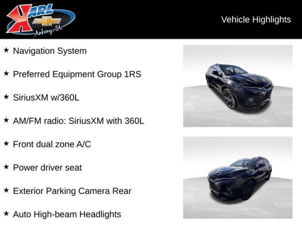 At Karl Chevrolet we want to help you find the best new or used car in Ankeny that suits your needs. Check out the 2022 Chevrolet Blazer For Sale in Ankeny, IA. When you buy a new car at Karl Chevrolet you know you're finding a vehicle you can rely on. We have a great selection of Platinum Quality Pre-Owned Vehicles. We also pride ourselves in creating a friendly atmosphere and reliable new car dealership that you can trust. Call us with any questions about our 2022 Chevrolet Blazer and our experts will be glad to help you! (515) 299-4300. *Equipment and options are generated by a 3rd party vendor, exact vehicle options may vary. Please see a salesperson for complete details and vehicle information.