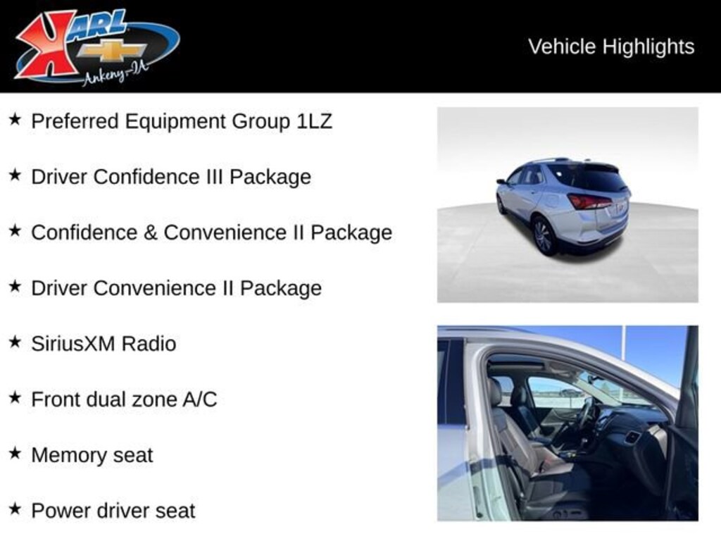 At Karl Chevrolet we want to help you find the best new or used car in Ankeny that suits your needs. When you buy a new car at Karl Chevrolet you know you're finding a vehicle you can rely on. We have a great selection of Platinum Quality Pre-Owned Vehicles. We also pride ourselves in creating a friendly atmosphere and a reliable Dealership that you can trust. Call us and our experts will be glad to help you! (515) 299-4300. *Equipment and options are generated by a 3rd party vendor, exact vehicle options may vary. Please see a salesperson for complete details and vehicle information.