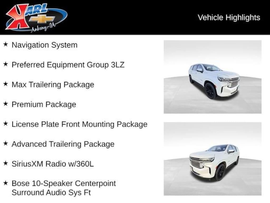 Recent Arrival! Clean CARFAX. Local Trade & Sold New at Karls! Equipped With Running Boards! Certified. Iridescent Pearl Tricoat 2022 Chevrolet Tahoe High Country 4DR 4WD EcoTec3 6.2L V8 4WD, Jet Black Leather, 15 Diagonal Multi-Color Head-Up Display, 1st & 2nd Row Color-Keyed Carpeted Floor Mats, 2-Speed Active Electronic AutoTrac Transfer Case, 3rd Row 60/40 Power-Folding Split-Bench Seat, Adaptive Cruise Control, Advanced Trailering Package, Apple CarPlay/Android Auto, Auto High-beam Headlights, Automatic Stop/Start, Bose 10-Speaker Centerpoint Surround Audio Sys Ft, Bright Front & Rear Door Sill Plates, Chrome Door Handles w/Body-Color Strip, Color-Keyed Carpeting Floor Covering, Driver & Front Outboard Passenger Airbags, Dual Exhaust System, Dual-Pane Power Panoramic Sunroof, Enhanced Automatic Emergency Braking, Enhanced Driver Information Center, Extra Capacity Cooling System, Floor Console, Front dual zone A/C, Hands-Free Rear Power Programmable Liftgate, HD Surround Vision, Heads-Up Display, Heated & Ventilated Driver & Front Passenger Seats, Heated 2nd Row Outboard Seats, Heated Steering Wheel, Hill Descent Control, Hitch Guidance w/Hitch View, Infotainment Display, Inside Rearview Auto-Dimming Rear Camera Mirror, Integrated Trailer Brake Controller, Lane Change Alert w/Side Blind Zone Alert, Leather-Wrapped Steering Wheel, LED Daytime Running Lamps, License Plate Front Mounting Package, Max Trailering Package, Memory Settings, Navigation System, Outside Heated Power-Adjustable Mirrors, Power driver seat, Power Release 2nd Row Bucket Seats, Power Tilt & Telescopic Steering Column, Power-Retractable Assist Steps, Preferred Equipment Group 3LZ, Premium Package, Rain sensing wipers, Rear air conditioning, Rear Camera Mirror Washer, Rear Cross Traffic Alert, Rear Pedestrian Alert, Remote Start, Safety Alert Seat, Set of 4 Wheel Locks (LPO), SiriusXM Radio w/360L, Smart Trailer Integration Indicator, Trailer Side Blind Zone Alert, Universal Home Remote, Wheels: 22 x 9 Sterling Silver Premium Painted, Wireless Charging. 14/19 City/Highway MPG 10-Speed Automatic with Overdrive 4WDCertification Program Details: Karl Chevrolet of Ankeny, The Nation's #1 CarBravo certified dealer, where platinum quality vehicles and unmatched benefits come together! This vehicle qualifies for our CarBravo Certified program reserved for the highest-quality pre-owned vehicles that are 10 model years or newer and have less than 100,000 miles. Every CarBravo Certified vehicle includes: ? Comprehensive 126-Point Inspection Professionally inspected by factory-trained technicians to meet strict mechanical, safety, and cosmetic standards. ? 6-Month / 6,000-Mile Bumper-to-Bumper Limited Warranty Enjoy added peace of mind with extensive coverage from the day you drive off the lot. ? 24/7 Roadside Assistance & Courtesy Transportation Flat tire? Dead battery? Need a tow? You're covered anywhere, anytime throughout the warranty period. ? Vehicle History & Title Guarantee Clean title, completed safety recalls, and a full CARFAX® or AutoCheck® report provided for complete transparency. ? 10-Day / 500-Mile Exchange Promise If you don't absolutely love it, bring it back and exchange it no hassle, no stress. Experience peace of mind and premium protection exclusively from Karl Chevrolet of Ankeny, the Nation's #1 CarBravo Certified Deale