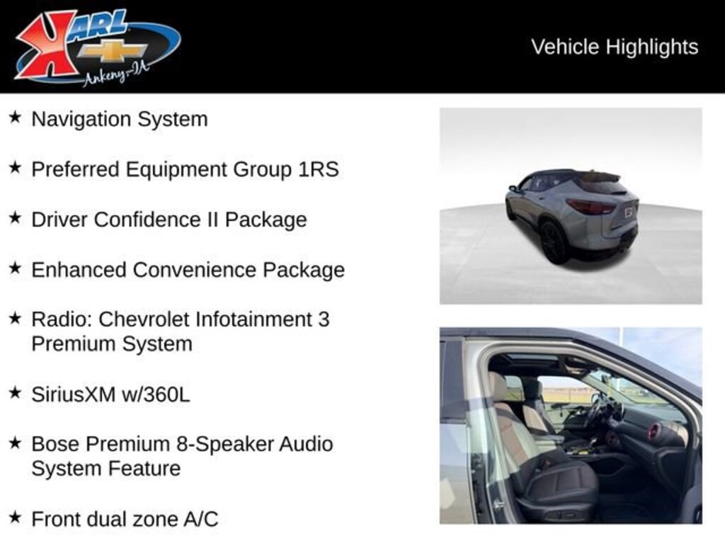 Recent Arrival! CARFAX One-Owner. Clean CARFAX. Certified. Sterling Gray Metallic 2024 Chevrolet Blazer RS 4DR AWD RS 3.6L V6 SIDI AWD, Adaptive Cruise Control, Apple CarPlay/Android Auto, Auto High-beam Headlights, Black 2-Tone Roof, Bose Premium 8-Speaker Audio System Feature, Driver Confidence II Package, Enhanced Automatic Emergency Braking, Enhanced Convenience Package, Front dual zone A/C, HD Surround Vision, Heated Driver & Front Passenger Seats, Heated Rear Outboard Seating Positions, Heated Steering Wheel, Memory Settings For Driver Seat & Exterior Mirrors, Navigation System, Power driver seat, Power Panoramic Tilt-Sliding Sunroof, Power Tilt & Telescoping Steering Column, Preferred Equipment Group 1RS, Radio: Chevrolet Infotainment 3 Premium System, Rear Camera Mirror, Rear Camera Mirror Washer, Safety Alert Seat, SiriusXM w/360L, Ventilated Driver & Front Passenger Seats, Wheels: 20 Gloss Black Aluminum. 18/26 City/Highway MPG 9-Speed Automatic with Overdrive AWDAt Karl Chevrolet we want to help you find the best new or used car in Ankeny that suits your needs. Check out the 2024 Chevrolet Blazer For Sale in Ankeny, IA. When you buy a new car at Karl Chevrolet you know you're finding a vehicle you can rely on. We have a great selection of Platinum Quality Pre-Owned Vehicles. We also pride ourselves in creating a friendly atmosphere and reliable new car dealership that you can trust. Call us with any questions about our 2024 Chevrolet Blazer and our experts will be glad to help you! (515) 299-4300. *Equipment and options are generated by a 3rd party vendor, exact vehicle options may vary. Please see a salesperson for complete details and vehicle information.Certification Program Details: Karl Chevrolet of Ankeny, The Nation's #1 CarBravo certified dealer, where platinum quality vehicles and unmatched benefits come together! This vehicle qualifies for our CarBravo Certified program reserved for the highest-quality pre-owned vehicles that are 10 model years or newer and have less than 100,000 miles. Every CarBravo Certified vehicle includes: ? Comprehensive 126-Point Inspection Professionally inspected by factory-trained technicians to meet strict mechanical, safety, and cosmetic standards. ? 6-Month / 6,000-Mile Bumper-to-Bumper Limited Warranty Enjoy added peace of mind with extensive coverage from the day you drive off the lot. ? 24/7 Roadside Assistance & Courtesy Transportation Flat tire? Dead battery? Need a tow? You're covered anywhere, anytime throughout the warranty period. ? Vehicle History & Title Guarantee Clean title, completed safety recalls, and a full CARFAX® or AutoCheck® report provided for complete transparency. ? 10-Day / 500-Mile Exchange Promise If you donât absolutely love it, bring it back and exchange it no hassle, no stress. Experience peace of mind and premium protection exclusively from Karl Chevrolet of Ankeny, the Nation's #1 CarBravo Certified Deale