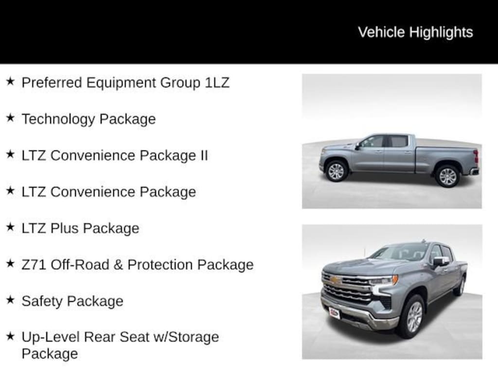 This Silverado 1500 LTZ is not only capable, but also packed with premium features that will make every drive a pleasure. Enjoy the comfort of heated and ventilated front seats, the convenience of a power tailgate, and the peace of mind of advanced safety technologies like Rear Cross Traffic Braking and Rear Pedestrian Alert.