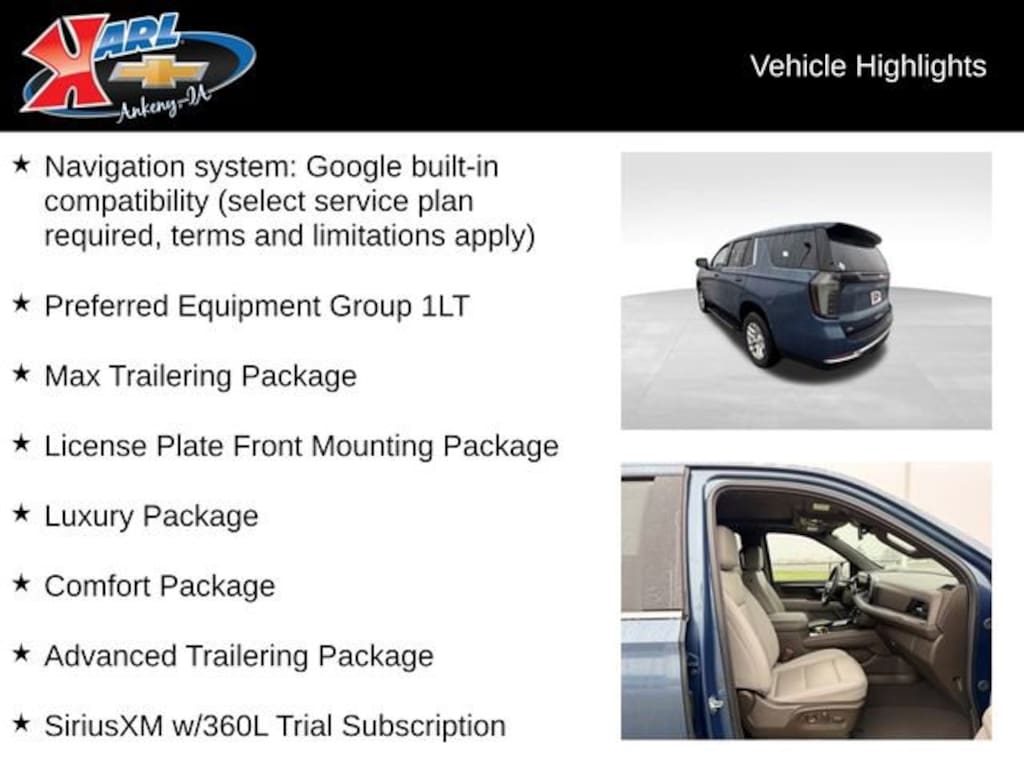 Recent Arrival! CARFAX One-Owner & Sold New at Karls! Equipped With Running Boards! Clean CARFAX. Certified. Lakeshore Blue Metallic 2025 Chevrolet Tahoe LT 4WD 4DR LT EcoTec3 5.3L V8 4WD, Gideon/Very Dark Atmosphere Leather, 1st & 2nd Row Color-Keyed Carpeted Floor Mats, 2-Speed Active Electronic AutoTrac Transfer Case, 3-Spoke Wrapped Steering Wheel, 3rd Row 60/40 Power-Folding Split-Bench Seat, 6-Speaker Audio System Feature, Advanced Trailering Package, Apple CarPlay/Android Auto, Auto High-beam Headlights, Auto-Dimming Inside Rear-View Mirror, Blind Zone Steering Assist w/Trailering, Bose 10-Speaker Centerpoint Surround Audio Sys Ft, Color-Keyed Carpeting Floor Covering, Comfort Package, Dual-Pane Power Panoramic Sunroof, Exterior Parking Camera Rear, Floor Console w/Storage Area, Front dual zone A/C, Front LED Fog Lamps, Front Pedestrian & Bicyclist Braking, Frontal Driver & Outboard Passenger Airbags, Heated 2nd Row Outboard Seats, Heated Driver & Front Passenger Seats, Heated Steering Wheel, Hill Descent Control, Hitch View w/Pan/Zoom Image Adjustment, Integrated Trailer Brake Controller, LED Headlamps w/LED Daytime Running Lamps, LED Tail Lamps, License Plate Front Mounting Package, Luxury Package, Max Trailering Package, Memory Settings, Memory Settings for Driver, Navigation system: Google built-in compatibility (select service plan required, terms and limitations apply), Outside Heated Power-Adjustable Mirrors, Power driver seat, Power Release 2nd Row Bucket Seats, Preferred Equipment Group 1LT, Radio: 17.7 Diagonal Advanced Color LCD Display, Rain sensing wipers, Rear air conditioning, Rear Power Liftgate, Remote Start, SiriusXM w/360L Trial Subscription, Smart Trailer Integration Indicator, Universal Home Remote, USB Ports, Wheels: 18 x 8.5 Bright Silver Painted Aluminum, Wireless Phone Charging. 15/20 City/Highway MPG 10-Speed Automatic with Overdrive 4WD