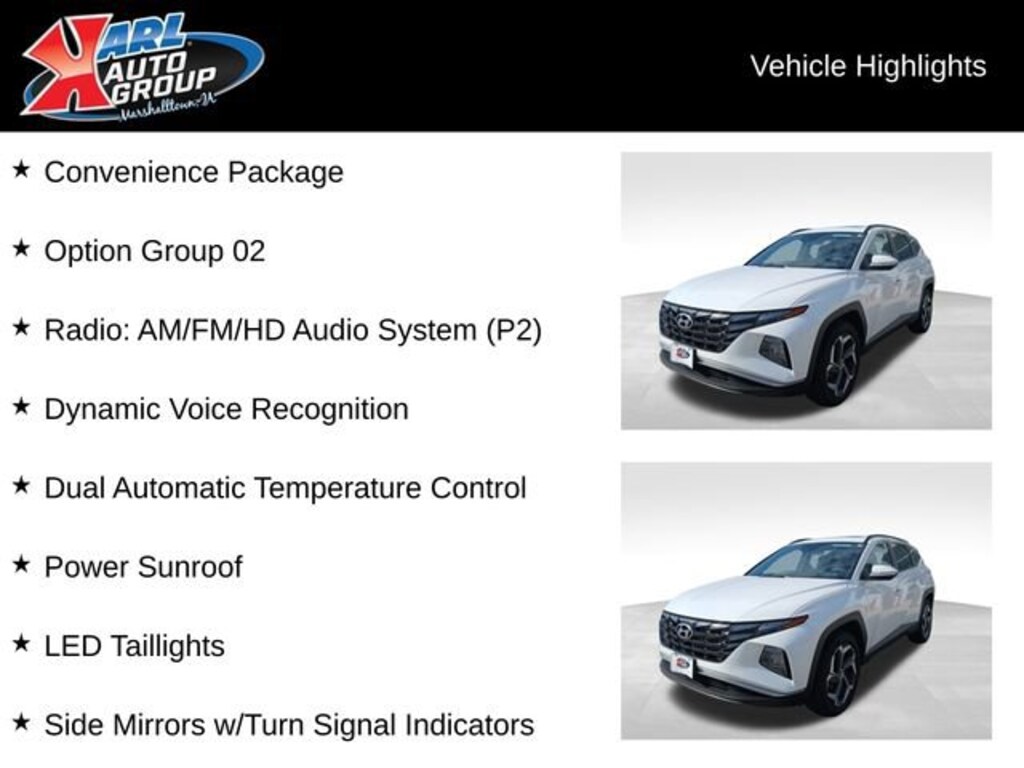 Recent Arrival! Odometer is 25522 miles below market average! Certified. CARFAX One-Owner. Clean CARFAX. White Pearl 2024 Hyundai Tucson 4D Sport Utility SEL 2.5L I4 DGI DOHC 16V LEV3-SULEV30 187hp 23/29 City/Highway MPG 8-Speed Automatic with SHIFTRONIC AWD, 10.25 Digital Instrument Cluster, 10.25 Navigation System (AVNT), Ambient Interior Lighting, Auto-Dimming Interior Mirror, Convenience Package, Dual Automatic Temperature Control, Dynamic Voice Recognition, H-Tex Seat Trim, Leather-Wrapped Shift Knob, Leather-Wrapped Steering Wheel, LED Interior Lights (Room, Map), LED Taillights, Option Group 02, Power Sunroof, Radio: AM/FM/HD Audio System (P2), Side Mirrors w/Turn Signal Indicators, Ultrasonic Rear Occupant Alert, Wheels: 19 x 7.5J Machine-Face Finish Alloy.