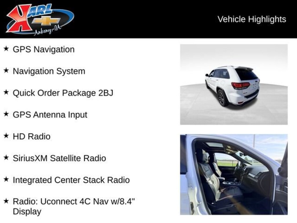 Certification Program Details: Karl Chevrolet of Ankeny, The Nation's #1 CarBravo Certified Dealer! Every CarBravo Certified vehicle includes: Comprehensive 126-Point Inspection Professionally inspected by factory-trained technicians to meet strict mechanical, safety, and cosmetic standards. 12-Month / 12,000-Mile Bumper-to-Bumper Limited Warranty Enjoy added peace of mind with extensive coverage from the day you drive off the lot. 24/7 Roadside Assistance & Courtesy Transportation Flat tire? Dead battery? Need a tow? You're covered anywhere, anytime throughout the warranty period. Vehicle History & Title Guarantee Clean title, completed safety recalls, and a full CARFAX® or AutoCheck® report provided for complete transparency. 10-Day / 500-Mile Exchange Promise If you don't absolutely love it, bring it back and exchange it no hassle, no stress. Experience peace of mind and premium protection exclusively from Karl Chevrolet of Ankeny, the Nation's #1 CarBravo Dealer!- Quick Order Package 2BJ- GPS Antenna Input- HD Radio- Integrated Center Stack Radio- Radio: Uconnect 4C Nav w/8.4 Display- SiriusXM Satellite Radio- Front dual zone A/C- Memory seat- Power driver seat- Power Liftgate- Fully automatic headlights- 1-Year SiriusXM Guardian Trial- 4G LTE Wi-Fi Hot Spot- 8.4 Touchscreen Display- Apple CarPlay/Android AutoThis stunning 2020 Jeep Grand Cherokee Trailhawk 4x4 is a true off-road champion, ready to take on any adventure with its impressive 3.6L V6 engine and 8-speed automatic transmission. With a sleek white exterior and a wealth of premium features, this Jeep is the perfect blend of capability and sophistication.Step inside and you'll be greeted by a spacious and well-appointed cabin, complete with heated and ventilated front seats, a heated steering wheel, and a panoramic sunroof to let in plenty of natural light. The Uconnect 4C navigation system with an 8.4-inch touchscreen display puts all your essential controls at your fingertips, seamlessly integrating with your smartphone via Apple CarPlay and Android Auto.But this Jeep Grand Cherokee isn't just about creature comforts - it's also a true off-road beast. The Trailhawk trim level comes equipped with a rugged 4x4 system, an air suspension, and a host of advanced off-road features to tackle the toughest terrain. Whether you're tackling the trails or cruising down the highway, this Jeep delivers a confident and comfortable driving experience.With its impressive combination of capability, technology, and premium amenities, this 2020 Jeep Grand Cherokee Trailhawk 4x4 is the perfect choice for the adventurous driver who demands the best. Come in and experience it for yourself - we're confident you'll be impressed.This Jeep Grand Cherokee is also part of our exclusive CarBravo Certified Pre-Owned program, which means it has undergone a rigorous 126-point inspection and comes with a comprehensive 12-month/12,000-mile bumper-to-bumper warranty, 24/7 roadside assistance, and a 10-day/500-mile exchange promise. You can drive with confidence, knowing that this vehicle has been thoroughly inspected and is ready to provide you with years of reliable service.At Karl Chevrolet we want to help you find the best new or used car in Ankeny that suits your needs. When you buy a new car at Karl Chevrolet you know you're finding a vehicle you can rely on. We have a great selection of Platinum Quality Pre-Owned Vehicles. We also pride ourselves in creating a friendly atmosphere and a reliable Dealership that you can trust. Call us and our experts will be glad to help you! (515) 299-4300. *Equipment and options are generated by a 3rd party vendor, exact vehicle options may vary. Please see a salesperson for complete details and vehicle information.
