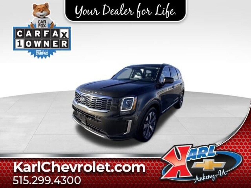 Recent Arrival! CARFAX One Owner & Local Trade! Certified. Dark Moss 2020 Kia Telluride S 3.8L V6 DGI DOHC Dual CVVT 3rd row seats: split-bench, Apple CarPlay & Android Auto, Heated Front Bucket Seats, Power driver seat, Power moonroof, Radio: AM/FM/MP3/SiriusXM Audio System, Rear air conditioning, SOFINO Artificial Leather Upholstery, Tow Hitch w/Harness. 19/24 City/Highway MPG 8-Speed Automatic AWDAt Karl Chevrolet we want to help you find the best new or used car in Ankeny that suits your needs. Check out the 2020 Kia Telluride For Sale in Ankeny, IA. When you buy a new car at Karl Chevrolet you know you're finding a vehicle you can rely on. We have a great selection of Platinum Quality Pre-Owned Vehicles. We also pride ourselves in creating a friendly atmosphere and reliable new car dealership that you can trust. Call us with any questions about our 2020 Kia Telluride and our experts will be glad to help you! (515) 299-4300. *Equipment and options are generated by a 3rd party vendor, exact vehicle options may vary. Please see a salesperson for complete details and vehicle information.Certification Program Details: Karl Chevrolet of Ankeny, The Nation's #1 CarBravo certified dealer, where platinum quality vehicles and unmatched benefits come together! This vehicle qualifies for our CarBravo Certified program reserved for the highest-quality pre-owned vehicles that are 10 model years or newer and have less than 100,000 miles. Every CarBravo Certified vehicle includes: ? Comprehensive 126-Point Inspection Professionally inspected by factory-trained technicians to meet strict mechanical, safety, and cosmetic standards. ? 6-Month / 6,000-Mile Bumper-to-Bumper Limited Warranty Enjoy added peace of mind with extensive coverage from the day you drive off the lot. ? 24/7 Roadside Assistance & Courtesy Transportation Flat tire? Dead battery? Need a tow? You're covered anywhere, anytime throughout the warranty period. ? Vehicle History & Title Guarantee Clean title, completed safety recalls, and a full CARFAX® or AutoCheck® report provided for complete transparency. ? 10-Day / 500-Mile Exchange Promise If you don't absolutely love it, bring it back and exchange it no hassle, no stress. Experience peace of mind and premium protection exclusively from Karl Chevrolet of Ankeny, the Nation's #1 CarBravo Certified Deale