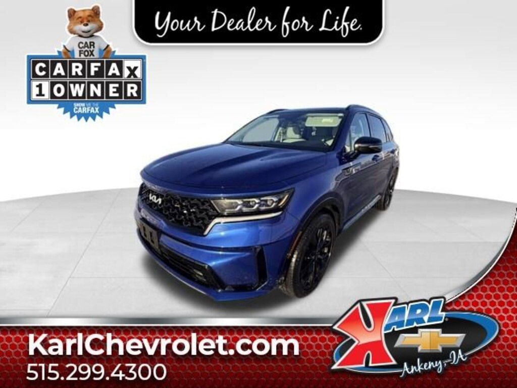 Recent Arrival! CARFAX One Owner & Local Trade! Clean CARFAX. Certified. Sapphire Blue 2023 Kia Sorento SX SX FWD 2.5L I4 DGI Turbocharged DOHC 16V LEV3-ULEV70 281hp 3rd row seats: split-bench, Apple CarPlay & Android Auto, Auto High-beam Headlights, Exterior Parking Camera Rear, Front dual zone A/C, Heated Front Bucket Seats, Navigation System, Power driver seat, Power moonroof, Radio: AM/FM Audio System, Rain sensing wipers, Rear air conditioning, Smart Key w/ Push Button and Remote Start, Wheels: 8.5J x 20 Gloss Black Alloy. 22/29 City/Highway MPG 8-Speed DCT FWDAt Karl Chevrolet we want to help you find the best new or used car in Ankeny that suits your needs. Check out the 2023 Kia Sorento For Sale in Ankeny, IA. When you buy a new car at Karl Chevrolet you know you're finding a vehicle you can rely on. We have a great selection of Platinum Quality Pre-Owned Vehicles. We also pride ourselves in creating a friendly atmosphere and reliable new car dealership that you can trust. Call us with any questions about our 2023 Kia Sorento and our experts will be glad to help you! (515) 299-4300. *Equipment and options are generated by a 3rd party vendor, exact vehicle options may vary. Please see a salesperson for complete details and vehicle information.Certification Program Details: Karl Chevrolet of Ankeny, The Nation's #1 CarBravo certified dealer, where platinum quality vehicles and unmatched benefits come together! This vehicle qualifies for our CarBravo Certified program reserved for the highest-quality pre-owned vehicles that are 10 model years or newer and have less than 100,000 miles. Every CarBravo Certified vehicle includes: ? Comprehensive 126-Point Inspection Professionally inspected by factory-trained technicians to meet strict mechanical, safety, and cosmetic standards. ? 6-Month / 6,000-Mile Bumper-to-Bumper Limited Warranty Enjoy added peace of mind with extensive coverage from the day you drive off the lot. ? 24/7 Roadside Assistance & Courtesy Transportation Flat tire? Dead battery? Need a tow? You're covered anywhere, anytime throughout the warranty period. ? Vehicle History & Title Guarantee Clean title, completed safety recalls, and a full CARFAX® or AutoCheck® report provided for complete transparency. ? 10-Day / 500-Mile Exchange Promise If you don't absolutely love it, bring it back and exchange it no hassle, no stress. Experience peace of mind and premium protection exclusively from Karl Chevrolet of Ankeny, the Nation's #1 CarBravo Certified Deale