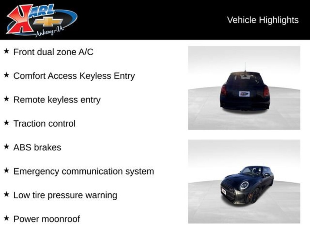 Recent Arrival! CARFAX One Owner & Local Trade! Clean CARFAX. Certified. Midnight Black 2024 MINI Cooper S Iconic COOPER S FWD 2.0L 16V TwinPower Turbo ABS brakes, Alloy wheels, Ambient Lighting, Apple CarPlay Compatibility, Auto High-beam Headlights, Brake assist, Comfort Access Keyless Entry, Dual Zone Auto Climate Control, Electronic Stability Control, Emergency communication system, Enhanced USB & Bluetooth, Heated door mirrors, Heated front seats, Illuminated entry, Lights Package, Low tire pressure warning, MINI Assist eCall, MINI Driving Modes, MINI TeleServices, Power moonroof, Remote keyless entry, SensaTec Leatherette Upholstery, SiriusXM Satellite Radio w/1 Year Subscription, Traction control. 28/38 City/Highway MPG 7-Speed Automatic FWDAt Karl Chevrolet we want to help you find the best new or used car in Ankeny that suits your needs. Check out the 2024 MINI Cooper S For Sale in Ankeny, IA. When you buy a new car at Karl Chevrolet you know you're finding a vehicle you can rely on. We have a great selection of Platinum Quality Pre-Owned Vehicles. We also pride ourselves in creating a friendly atmosphere and reliable new car dealership that you can trust. Call us with any questions about our 2024 MINI Cooper S and our experts will be glad to help you! (515) 299-4300. *Equipment and options are generated by a 3rd party vendor, exact vehicle options may vary. Please see a salesperson for complete details and vehicle information.Certification Program Details: Karl Chevrolet of Ankeny, The Nation's #1 CarBravo certified dealer, where platinum quality vehicles and unmatched benefits come together! This vehicle qualifies for our CarBravo Certified program reserved for the highest-quality pre-owned vehicles that are 10 model years or newer and have less than 100,000 miles. Every CarBravo Certified vehicle includes: ? Comprehensive 126-Point Inspection Professionally inspected by factory-trained technicians to meet strict mechanical, safety, and cosmetic standards. ? 6-Month / 6,000-Mile Bumper-to-Bumper Limited Warranty Enjoy added peace of mind with extensive coverage from the day you drive off the lot. ? 24/7 Roadside Assistance & Courtesy Transportation Flat tire? Dead battery? Need a tow? You're covered anywhere, anytime throughout the warranty period. ? Vehicle History & Title Guarantee Clean title, completed safety recalls, and a full CARFAX® or AutoCheck® report provided for complete transparency. ? 10-Day / 500-Mile Exchange Promise If you don't absolutely love it, bring it back and exchange it no hassle, no stress. Experience peace of mind and premium protection exclusively from Karl Chevrolet of Ankeny, the Nation's #1 CarBravo Certified Deale
