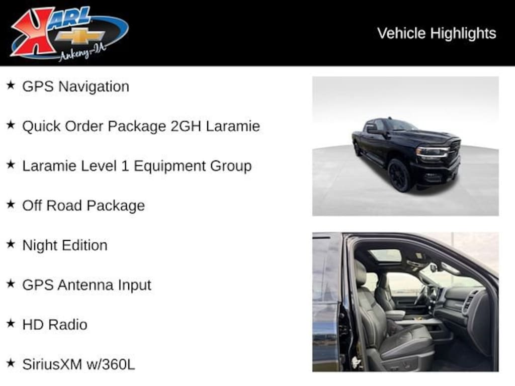 Recent Arrival! CARFAX One Owner & Local Trade! Equipped With Running Boards, Bed Liner, Mud Flaps & Tonneau Cover! Clean CARFAX. Certified. Diamond Black Crystal Pearlcoat 2024 Ram 2500 Laramie LARAMIE 4X4 CREW CAB 6.4L V8 12 Touchscreen Display, 2nd Row In Floor Storage Bins, 4G LTE Wi-Fi Hot Spot, Alexa Built-In, Apple CarPlay/Android Auto, Black Exterior Truck Badging, Black Headlamp Bezels, Black Interior Accents, Black Ram Head Tailgate Badge, Black Tail Lamp Bezels, Black Wheel Center Hub, Blind Spot & Cross Path Detection, Center Hub, Connected Travel & Traffic Services, Connectivity - US/Canada, Disassociated Touchscreen Display, Exterior Mirrors w/Memory, Foam Bottle Insert (Door Trim Panel), Forward & Reverse Utility Lights, Front dual zone A/C, Front LED Fog Lamps, Front Performance Tuned Shock Absorbers, Global Telematics Box Module (TBM), Gloss Black Grille Billets/Accents, Google Android Auto, GPS Antenna Input, GPS Navigation, HD Radio, Heated Front Seats, Heated Steering Wheel, Hill Descent Control, Integrated Voice Command w/Bluetooth, Laramie Level 1 Equipment Group, LED Reflector Headlamps, LED Tail Lamps, Mirror Running Lights, Night Edition, Off Road Package, Off-Road Information Pages, ParkSense Front/Rear Park Assist System, Power Adjust Mirrors, Power Adjustable Convex Aux Mirrors, Power Adjustable Pedals w/Memory, Power driver seat, Power Heated Fold Telescopic Mirrors w/Memory, Power Sunroof, Power Telescoping Mirrors, Quick Order Package 2GH Laramie, Radio: Uconnect 5 Nav w/12.0 Display, Rain Sensitive Windshield Wipers, Rear Performance Tuned Shock Absorbers, Rear Power Sliding Window, Rear Window Defroster, Remote Tailgate Release, Selectable Tire Fill Alert, SiriusXM Radio Service, SiriusXM w/360L, Sport Performance Hood, Tip Start, Tow Hooks, Trailer Tow Pages, Wheels: 20 x 8.0 Black Painted Aluminum. 8-Speed Automatic 4WD